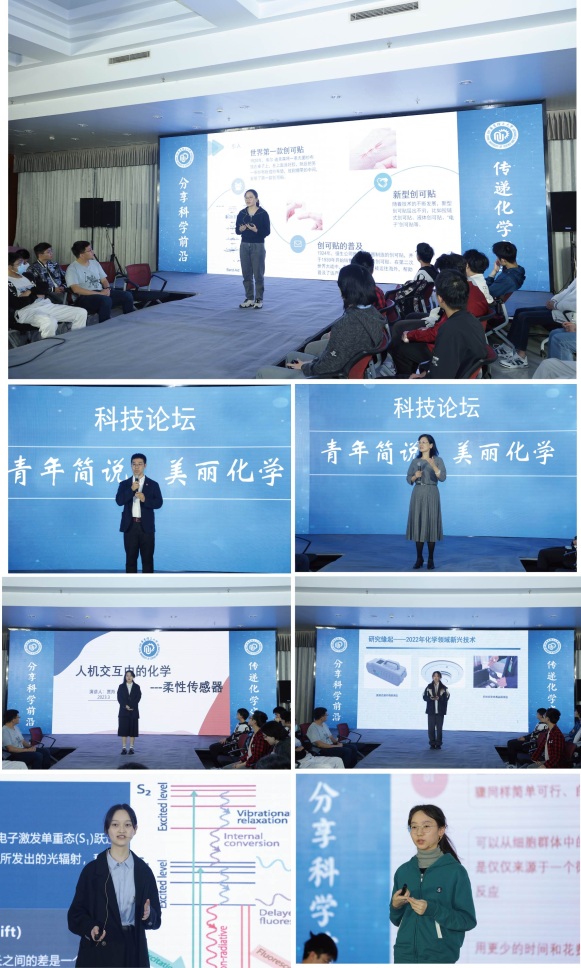 参赛的同学们紧扣“分享科学前沿,传递化学之美”的演讲主题,围绕新中国化学发展史、化学学科前沿研究进展、守正创新的科学精神等选题展开,演讲内容涵盖化学研究各个领域,包括柔性传感器、水凝胶、薄膜荧光传感器、荧光探针等。一项项高端的前沿科技介绍轮番出场,一段段精彩的演讲娓娓道来。王淳同学讲述了中科院李人元先生的聚丙烯腈基碳纤维研制,从七八十年代国内第一批碳纤维生产化企业复神鹰成立,到九十年代制定的第一个碳纤维及其复合材料的十年研究发展计划,让观众看到了一代代科研工作者科研报国的意志。贾羚同学以“人机交互中的化学”为主题,从影视作品中的外骨骼机械引出现实研发的外骨骼产品,用生动又严谨的语言向大家介绍了柔性传感器的原理及应用。张雨恬同学从大家熟知的创可贴引入,深入浅出地向大家介绍了以解决传统创可贴缺陷为目标的超声介导生物粘合剂,从技术对比、技术实施、技术应用三个方面阐述了这一新型技术的发展情况,体现出化学在生活方面的具体应用。王紫仪同学的演讲围绕化学领域新兴技术——传感器技术展开,向大家重点介绍了薄膜荧光传感器的定义、原理、制备和应用,并对薄膜荧光传感技术在创新驱动、解决卡脖子技术问题等方面提出了自己的理解和看法。“豆中贵族‘白芸豆’”这一标题刚出场便吸引了大家的注意,刘赛男同学从白芸豆在古籍中的记载切入,阐明了其药用价值和保健功能,接着又结合当下社会对减脂塑形的需求,引出了对白芸豆中α-淀粉酶抑制剂的研究以及其在治疗肠道微生物菌群疾病等更多应用可能性的展望。任晓珝同学的演讲主题是近红外Ⅱ区荧光探针的生物成像技术,她向大家详细讲解了荧光现象的发生、探针作用的机理、荧光探针的应用等方面,并重点介绍了其在生物成像方面的应用。