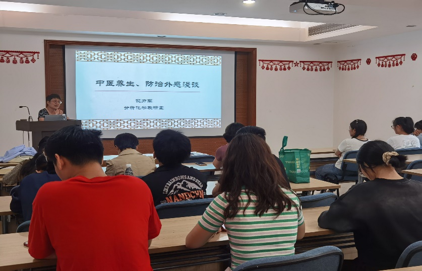 为深入开展学习贯彻习近平新时代中国特色社会主义思想主题教育,扎实开展“一个支部一件实事”活动,弘扬祖国优秀传统中医药文化,宣传中医药健康知识,提高师生健康素养意识,6月6日下午,分析化学教师党支部在实验三楼102举办了主题为“中医养生、防治外感漫谈”的讲座。