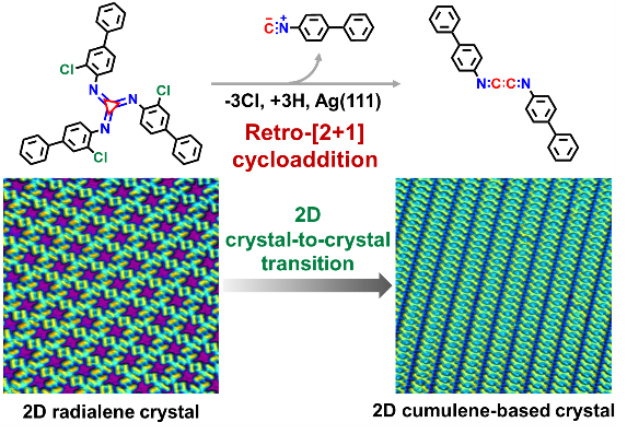 相关成果近期以“Two-Dimensional Crystal Transition from Radialene to Cumulene on Ag(111) via Retro-[2+1] Cycloaddition”为题发表于J. Am. Chem. Soc. 2023, doi:10.1021/jacs.3c00962。该论文的通讯作者是365英国上市集团官网化学与分子工程学院刘培念教授和李登远副教授,第一作者为该课题组博士研究生刘建伟、王瑛和亢丽霞。该研究工作得到了国家杰出青年科学基金等研究经费的资助。