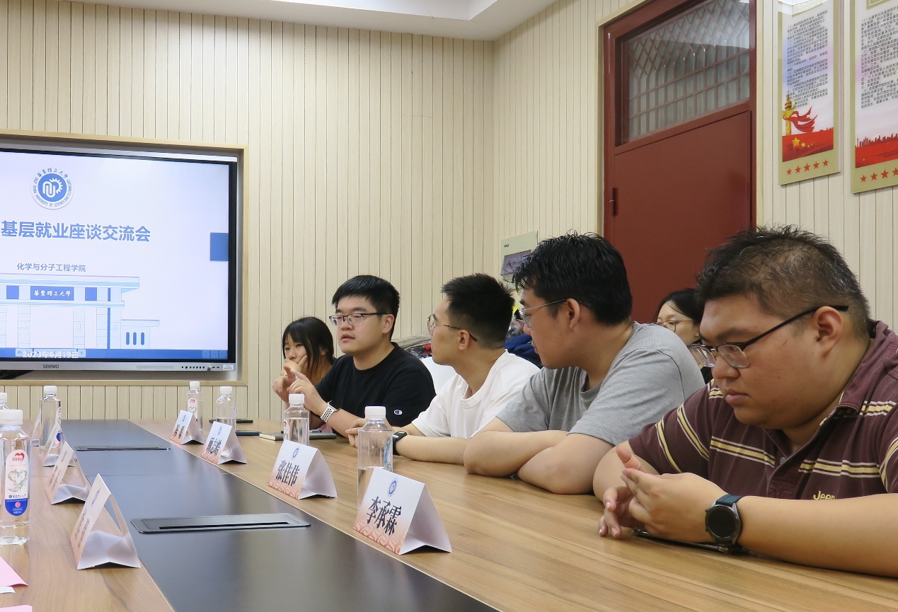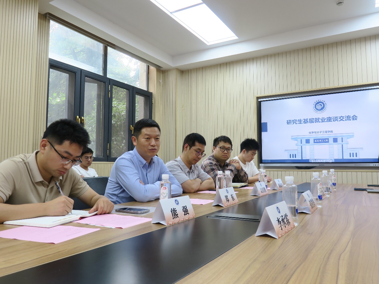 为落实学校就业引导工程相关部署,促进毕业生高质量充分就业,6月19日下午,化学学院召开研究生基层就业座谈会。活动邀请到录用为基层选调生的学院应届毕业生代表及从事基层工作的校友与在校研究生座谈交流。学工部副部长、学生就业指导服务中心主任郑东和化学学院党委副书记孟庆鹏出席了座谈会。
