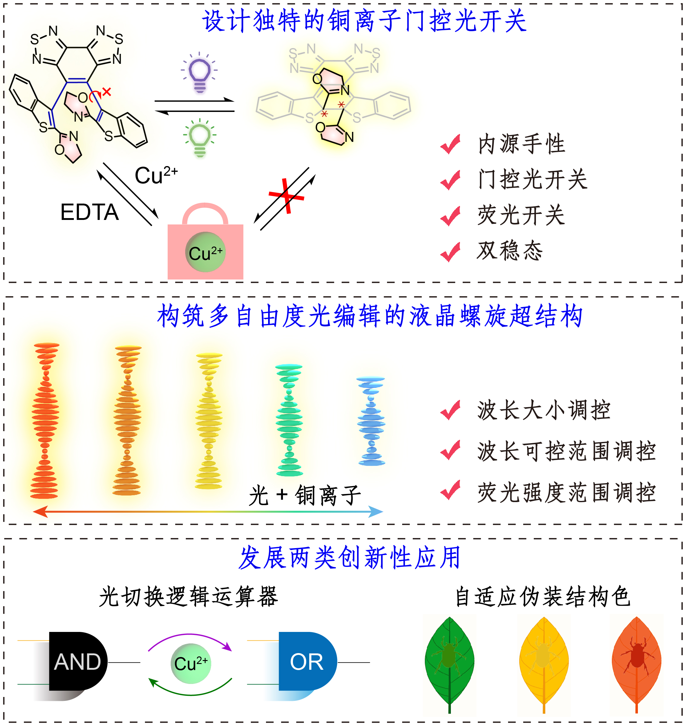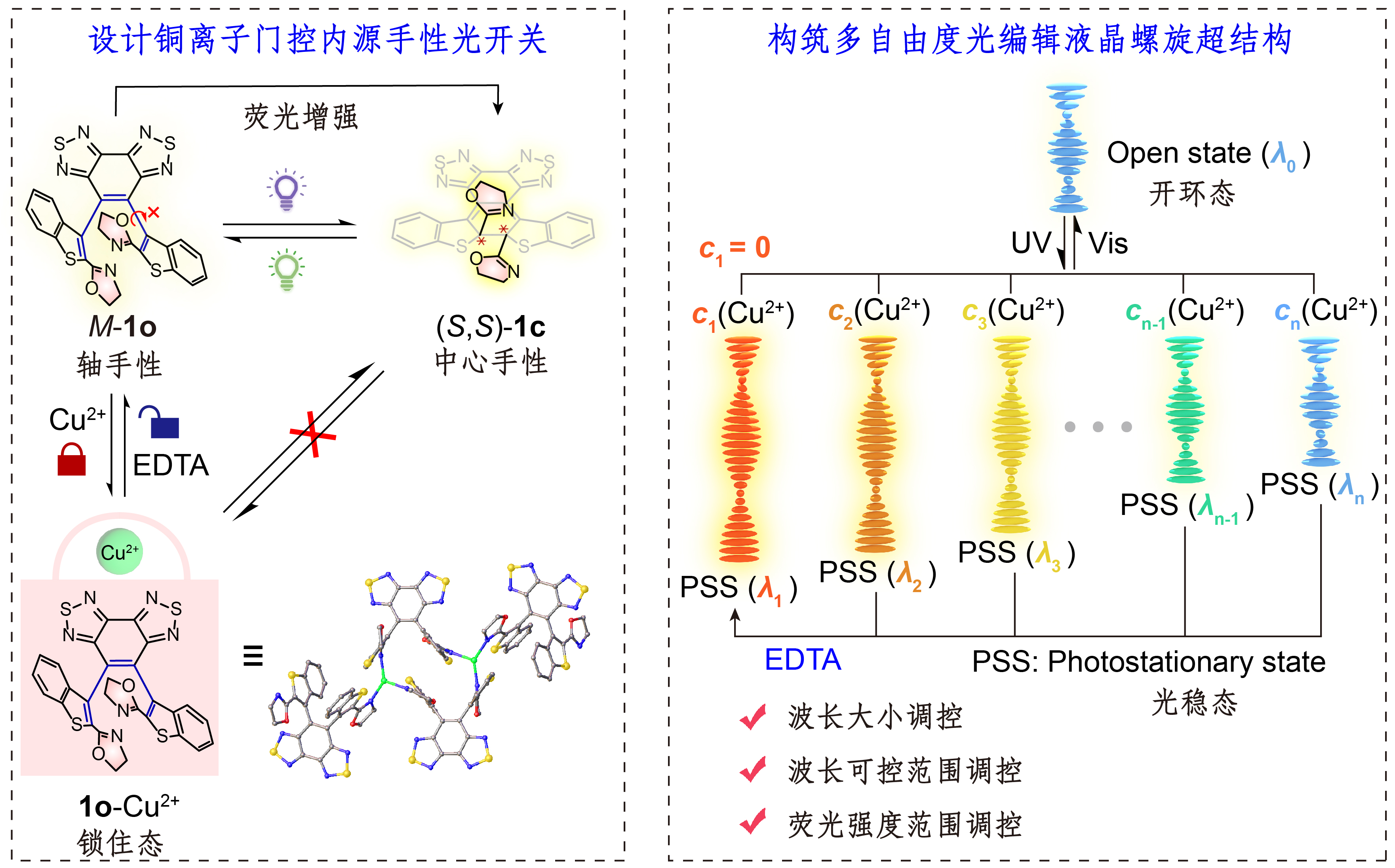 图1. 设计铜离子门控荧光性内源手性光开关,构筑多自由度光调控液晶螺旋超结构