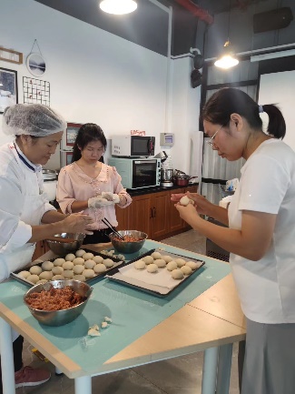 活动前,学院工会特地为大家精心准备好面团、馅料、手套、模具等材料。在老师的讲解演示下,大家迫不及待开始动手制作,揉皮、加馅、包月饼、放入模具按压成型,现场气氛温馨热闹。经过两个多小时的制作,一盒盒漂亮的冰皮月饼就制作完成了,活动现场弥漫着南瓜豆沙、蜜枣红芋的香甜味道。还有教师尝试挑战更高阶版的鲜肉月饼,纯猪肉制作、不添加味精与色素的鲜肉月饼香嫩不腻,表皮金黄酥脆,馅料十足多汁,一口下去,满满的幸福感。