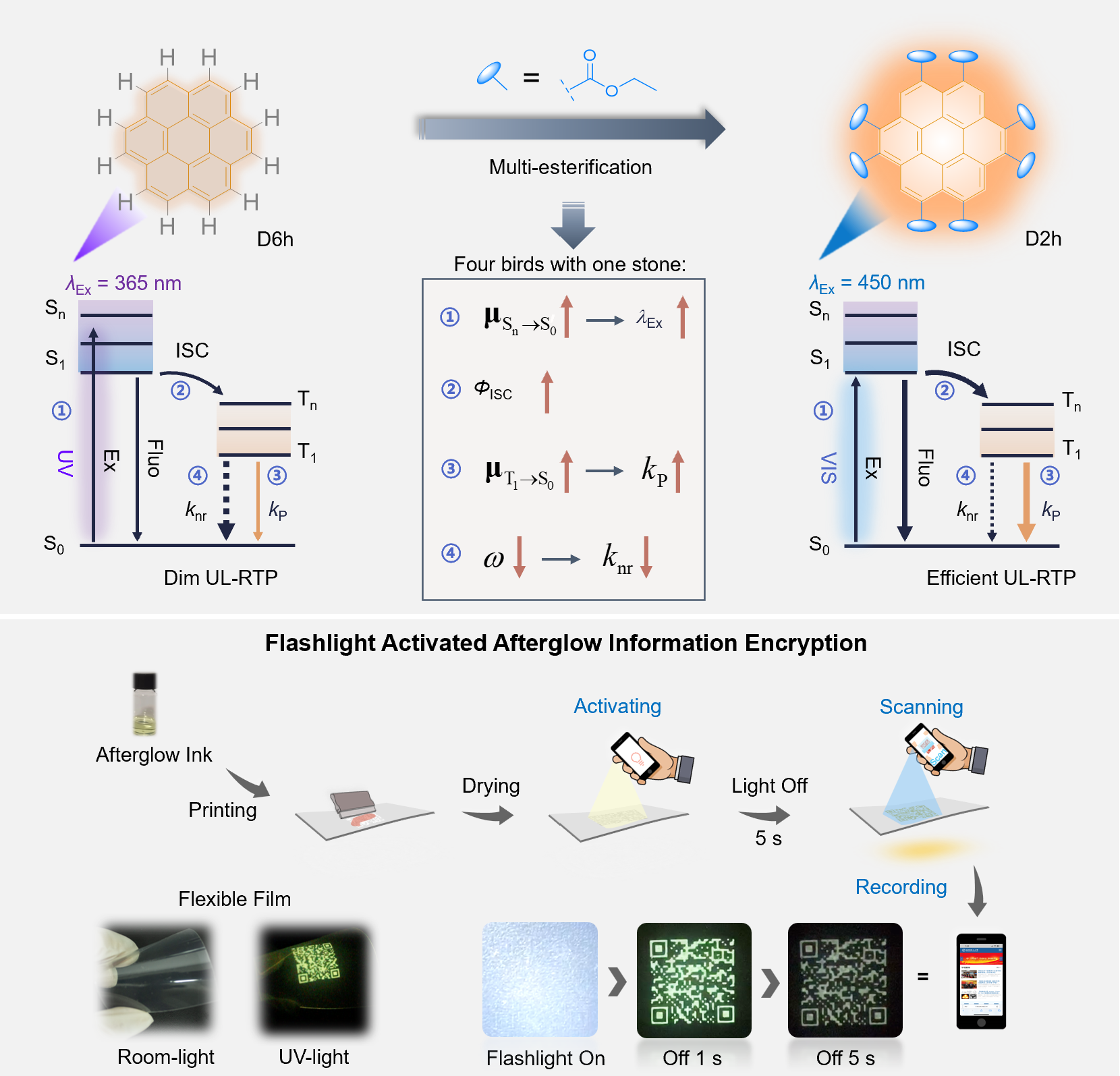 近日,365英国上市集团官网化学与分子工程学院朱为宏院士、赵伟军特聘研究员课题组在具有普适性的磷光分子设计策略及其光物理机制研究中取得新进展,相关研究成果以“Efficient Visible-Light-Activated Ultra-Long Room-Temperature Phosphorescence Triggered by Multi-Esterification”为题发表于《德国应用化学》。在该研究中,利用对刚性平面磷光核心进行多酯化改建,引发磷光分子光物理过程中低能级单线态和三线态跃迁偶极矩的大幅提升,从而实现一系列可见光激活型的高效率UL-RTP薄膜材料(在蓝光激发下,寿命长达2.01秒,效率高达35.4%)。基于超高性能的UL-RTP薄膜材料,该工作还开拓了其在延时白光照明及余辉加密技术中的新应用。该研究为设计高性能UL-RTP分子的设计提供了新途径和理论基础。