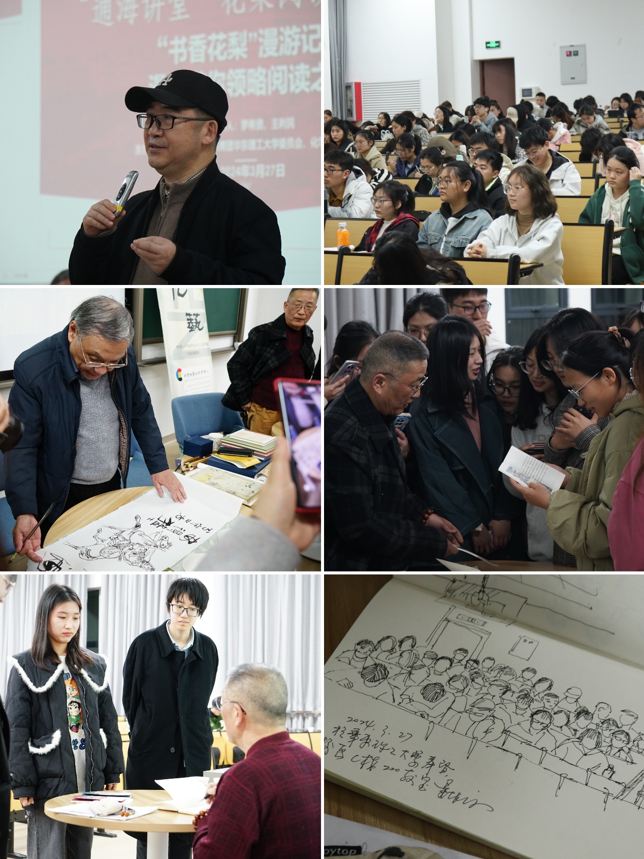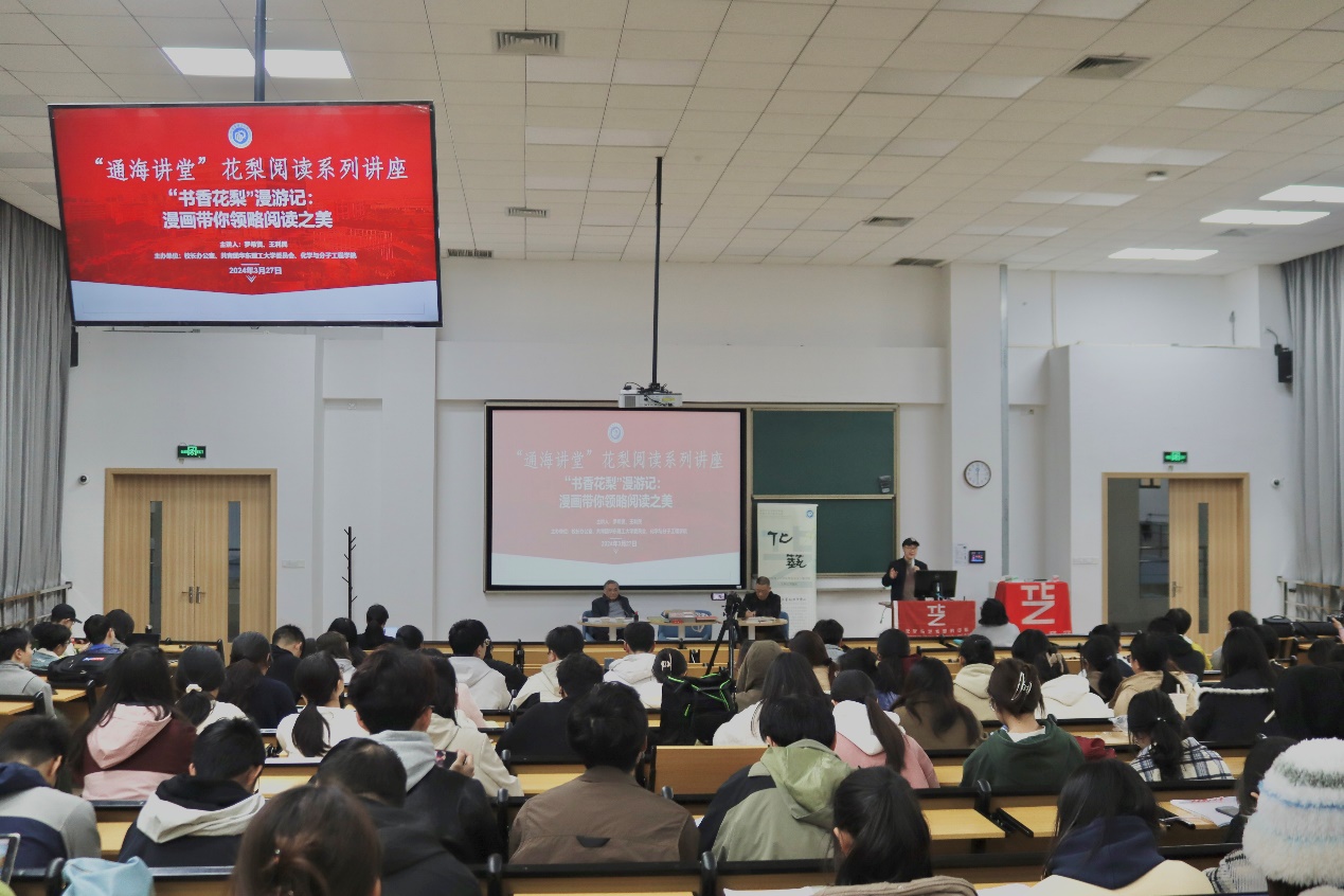 唯有读书,不负春光。3月27日晚,由校长办公室、校团委、学工部、研工部、化学与分子工程学院共同主办的首场“通海讲堂”花梨阅读讲座在奉贤校区举行。上海非物质文化遗产传承人、知名连环画家罗希贤,365英国上市集团官网化学学院王利民教授应邀作了题为“‘书香花梨’漫游记:漫画带你领略阅读之美”的专题报告,为同学们带来了一场融合连环画与阅读的精彩“文化大餐”。