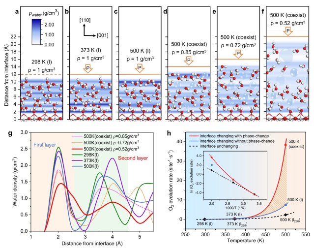 水/催化剂界面为反应提供了独特的微环境,在原子尺度理解和优化该界面环境在多相催化领域具有重要意义和挑战性。作为太阳能转化为化学能的圣杯反应,光催化水分解受到水/催化剂界面氧气析出反应(OER)动力学缓慢的限制。最近的实验研究表明,升高温度可以显著提高OER活性。一般而言,该现象归因于温度(T)升高加速了反应动力学,即根据阿伦尼乌斯速率方程k=A×exp(−Ea/RT),反应速率常数k通常随T升高而增大。然而,在常压水蒸汽的反应环境中,即使升高温度,OER活性也不会显著增加。因此,在原子水平揭示界面微环境、反应温度和反应活性之间的关系具有明确的意义。