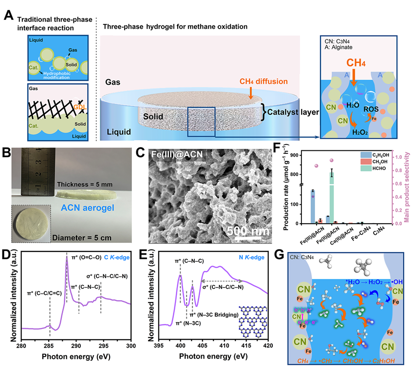 基于此,该团队围绕如何形成浓度相当的•CH3与•OH,设计了基于三相界面漂浮膜策略的CH4选择性制C2H5OH光催化体系。在前期利用水凝胶的动态收缩−回弹行为促进芬顿反应中金属离子价态的可逆转换的研究基础上 (Chem. Mater.2024, 36, 7, 3316),结合冷冻干燥和金属离子交联策略,构建了包埋C3N4的Fe(III)-交联的大孔海藻酸盐水凝胶膜 (Fe(III)@ACN)。该凝胶的轻质大孔结构使其可以稳定漂浮在气-水界面,形成气-固-液三相界面,通过缩短气体的扩散路径在常压下促进CH4分子与孔道内部活性物种的接触。光照下,利用Fe(III)@ACN的亲水性在C3N4上发生水氧化反应 (WOR) 产生H2O2;同时,光生电子还原生成的Fe(II)触发了与H2O2之间的Fenton反应生成•OH;三相界面处增强的气体传质有助于CH4与•OH反应生成•CH3,最终在•CH3与•OH浓度匹配的条件下,促进碳链增长,实现从CH4到CH3OH再到C2H5OH的转化。Fe(III)@ACN催化剂在常温常压下表现出优异的活性,醇类选择性达到96%,其中包括90%的C2H5OH。无需添加贵金属的情况下,C2H5OH的生成速率达到171.7 μmol g−1 h−1。
