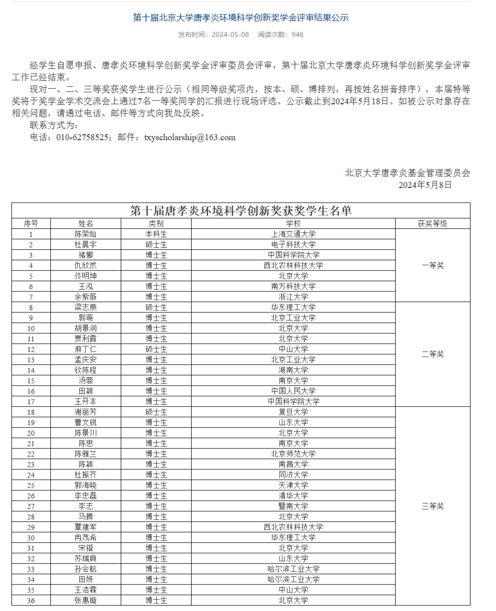 第十届北京大学唐孝炎环境科学创新奖学金评审结果公示链接:https://cese.pku.edu.cn/txyjxj/tzgg1/158450.htm