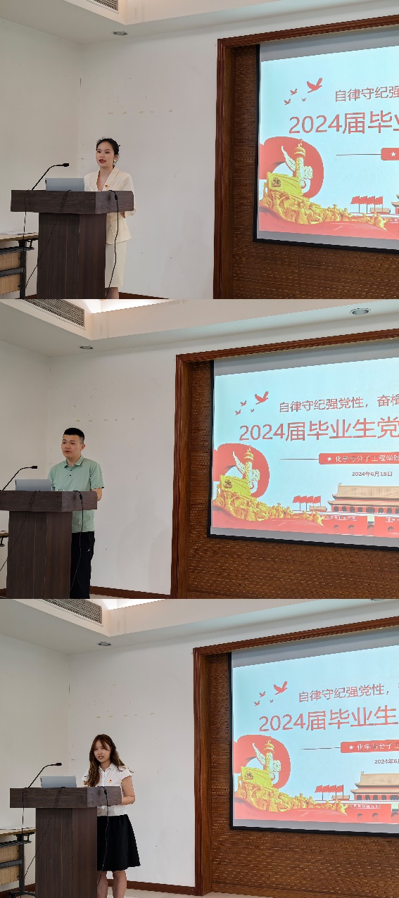 为深入学习贯彻习近平总书记关于党纪学习教育的重要讲话和指示批示精神,进一步加强毕业生党员的纪律教育,坚定毕业生党员理想信念, 6月18日,化学与分子工程学院以“自律守纪强党性,奋楫笃行启新程”为主题,开展了2024届毕业生党员离校教育。化学学院党委书记张文清、党委副书记孟庆鹏、组织员高丹以及毕业生党员代表参加了活动。活动由孟庆鹏主持。