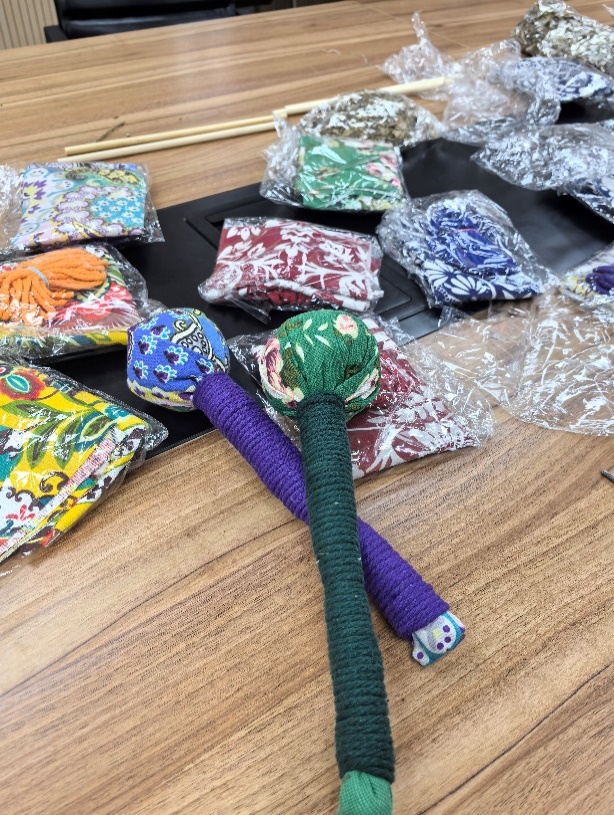 艾草具有温经散寒、祛湿止痛等功效,通过用艾草锤敲打身体特定部位,可以有效缓解肌肉疲劳,促进血液循环。活动中,大家跟着视频讲解一起动手制作艾草锤:将艾叶揉成团状,放入布袋中固定好;用支撑棒插入艾草包内,用彩色棉布包裹,再用棉线缠绕困绑,不一会儿,一个个充满艾草香味的养生锤便制作完成了。