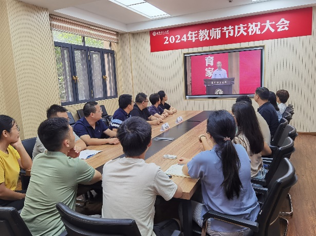 9月10日上午,学院党政领导班子成员和党政办全体教师在实验三楼137共同观看学校隆重举行的“大力弘扬教育家精神,加快建设教育强国”主题教师节庆祝大会视频直播,深入学习贯彻党的二十届三中全会精神和全国教育大会精神。
