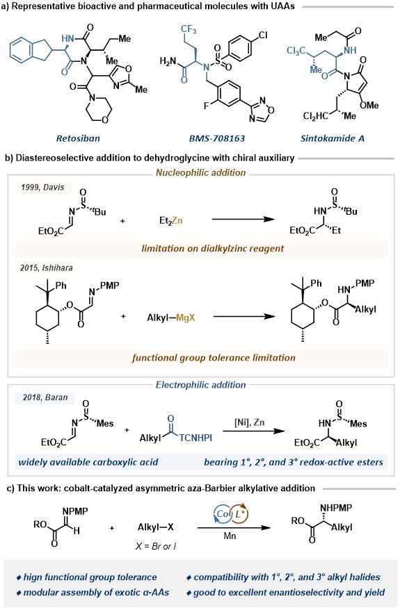 α-氨基酸广泛存在与自然界中,是构成蛋白质的基本结构,在药物分子中也有非常重要的应用,2022年小分子药物销售额排名前200的药物中,约24%的分子含有至少一个氨基酸骨架。经典的非天然α-氨基酸合成方法之一是通过使用手性辅基保护的脱氢甘氨酸与烷基金属试剂,如Negishi试剂、Grignard试剂等发生亲核加成反应得到。然而,金属试剂本身对水氧敏感、制备繁琐,官能团容忍性较差,大大限制了这类反应的发展。