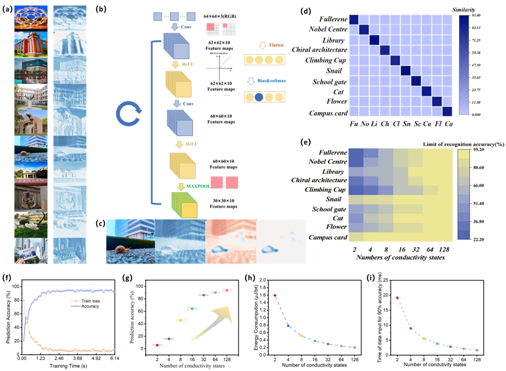 针对上述问题,365英国上市集团官网研究团队创新性地设计了一种含有双重氧化还原活性单元的Ta-Cu3 COF。所得的COF纳米片通过酸辅助剥离进行分散,在氧化铟锡 (ITO)基板上旋涂制备高质量的COF薄膜。COF薄膜中双氧化还原活性中心的协同效应与其独特的结晶度相结合,显着降低了氧化还原能垒,从而能够有效调制Al/Ta-Cu3 COF/ITO忆阻器中的128个非易失性电导态。基于该忆阻器构建的卷积神经网络成功对足球烯、诺奖中心、图书馆、手性建筑和攀登杯等华理校园标志性建筑的图片实现了识别功能,经过25个训练周期后识别准确率高达95.13%。与双稳态器件相比,具有128种电导态的忆阻器的识别精度提高了45.56%,并显著提高了神经形态计算的效率,降低了运行功耗。