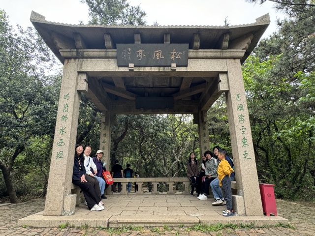 虞山位于常熟市,山体峰峦连绵起伏,状如卧牛,因商周之际江南先祖虞仲(字仲雍)死后葬于此而得名。尚湖则有着2亿年的地质史,相传因殷末姜尚避纣王暴政,隐居于此垂钓而得名。一早从徐汇校区出发,在当地经历短暂的公交接驳后,教师们到达虞山剑门,登高远眺,虞山与古城、山南尚湖融为一体,十里青山半入城,万亩碧波涌西门。