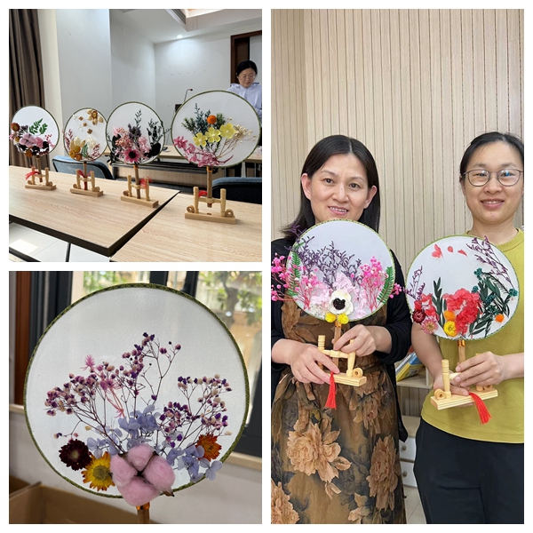 通过摆型、修剪、粘黏,老师们几乎无师自通,一朵朵干花、一簇簇绿叶,在大家的轻声细语、笑声晏晏中,在无尽的创意和想象力下,慢慢地在小小的团扇上展现出了独特风采,原本素白的扇面渐渐被点缀成一幅幅精美作品。这些团扇不仅展现了每位老师的精思巧意,也寄托了大家对美好生活的向往和追求。