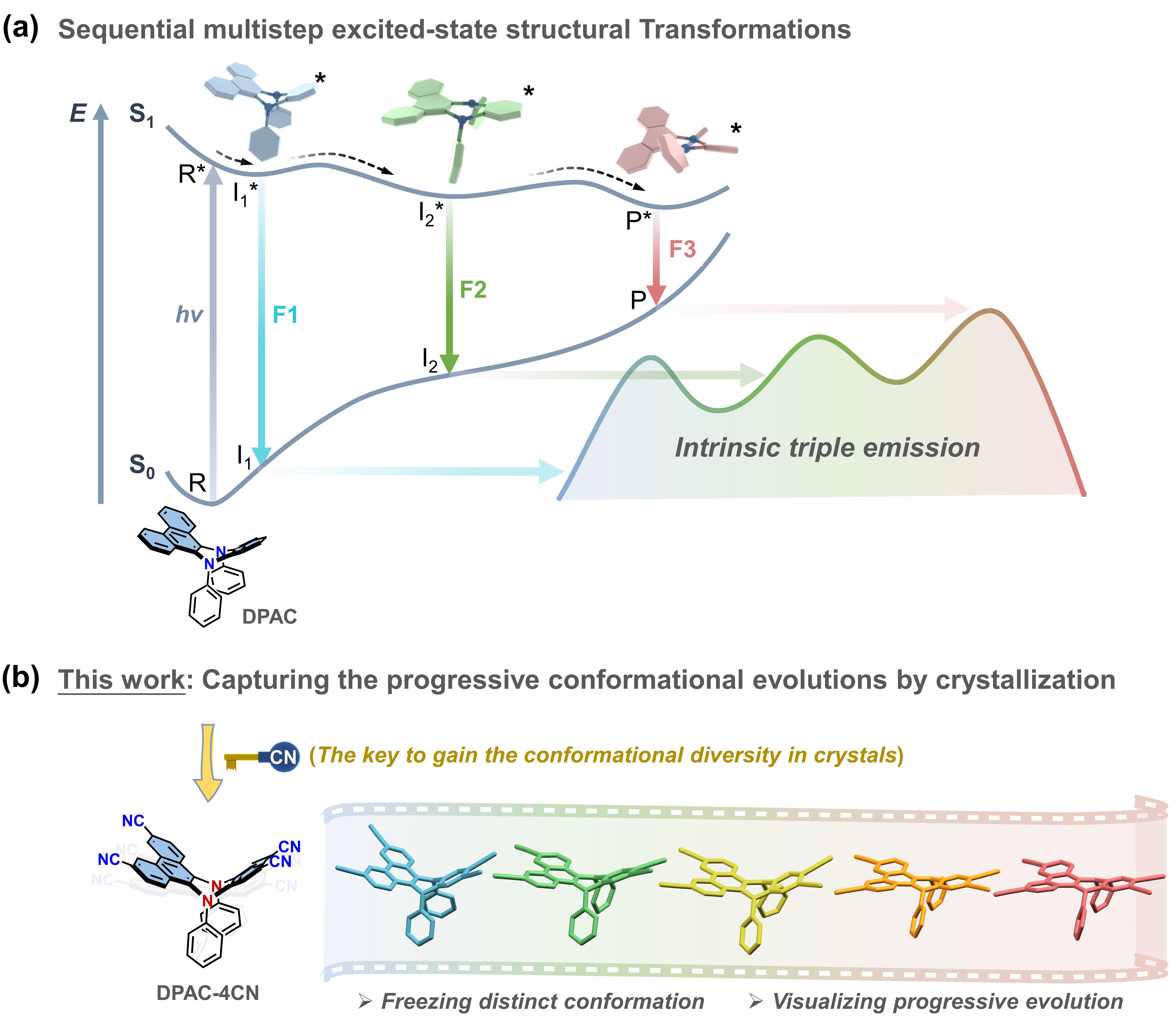 以N,N′-二苯基二氢二苯并[a,c]吩嗪(DPAC)为代表的位阻型二氢吩嗪因其独特的振动诱导发光性质而备受关注。DPAC分子在光激发后能够经历从弯曲、平面到扭曲的逐级构象演变,展现出独特的本征三重发射特性。在此前的研究中,田禾院士团队通过分子工程策略结合瞬态光谱和理论计算,系统揭示了结构变化与发射特性之间的关系(J. Am. Chem. Soc., 2022, 144, 4883; Angew. Chem. Int. Ed., 2023, 62, e202305572)。然而,目前仍缺乏直接的实验结构证据来清晰展示其构象演变过程。为此,该团队巧妙地通过化学修饰引入氰基(CN)作为吸电子基团,设计合成了一系列不同氰基取代数量的DPAC衍生物。氰基的引入有效调控了DPAC分子骨架的电子分布,并降低了构象转变的能量障碍,使这些分子在结晶过程中展现出丰富的构象多态性。这一策略有效地“冻结”了DPAC分子的不同构象,为直观地分析分子骨架奠定了基础。