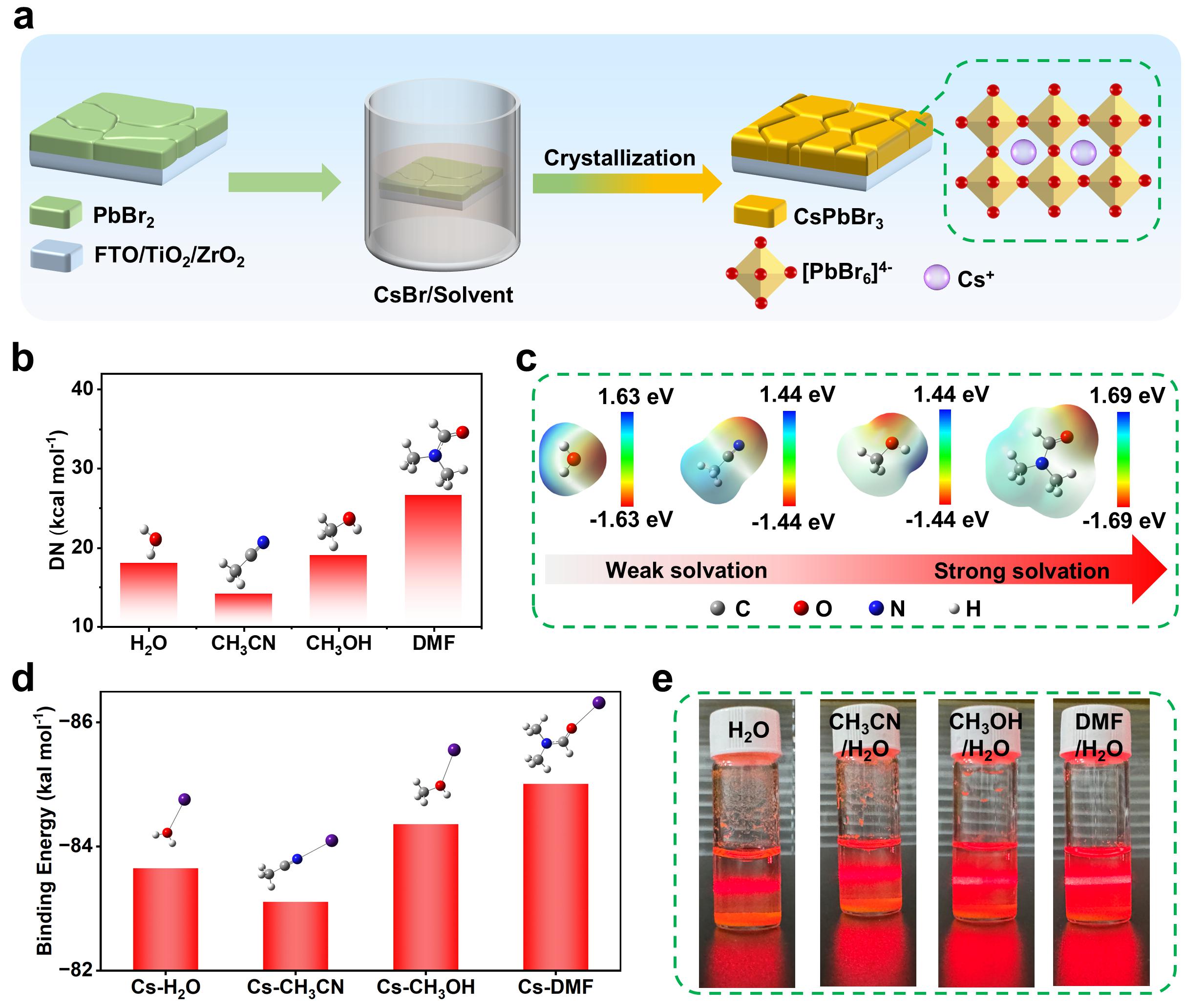 在传统的全无机CsPbBr₃钙钛矿太阳能电池的两步法合成工艺中,水相处理步骤在性能优化和长期稳定性提升方面已逐渐暴露出其局限性。为进一步提升全无机CsPbBr₃钙钛矿太阳能电池的光电性能,武文俊教授课题组创新提出了一种双溶剂工程策略。这一策略以密度泛函理论(DFT)计算和丁达尔效应分析为依托,精选出兼具高供体数与介电常数的溶剂,巧妙调节CsPbBr₃的表面Br/Pb比,成功诱导钙钛矿向p型转变,同时大幅抑制薄膜内部缺陷的产生。这些优化协同作用显著延长了载流子寿命、降低了缺陷密度,并提升了电荷传输效率。