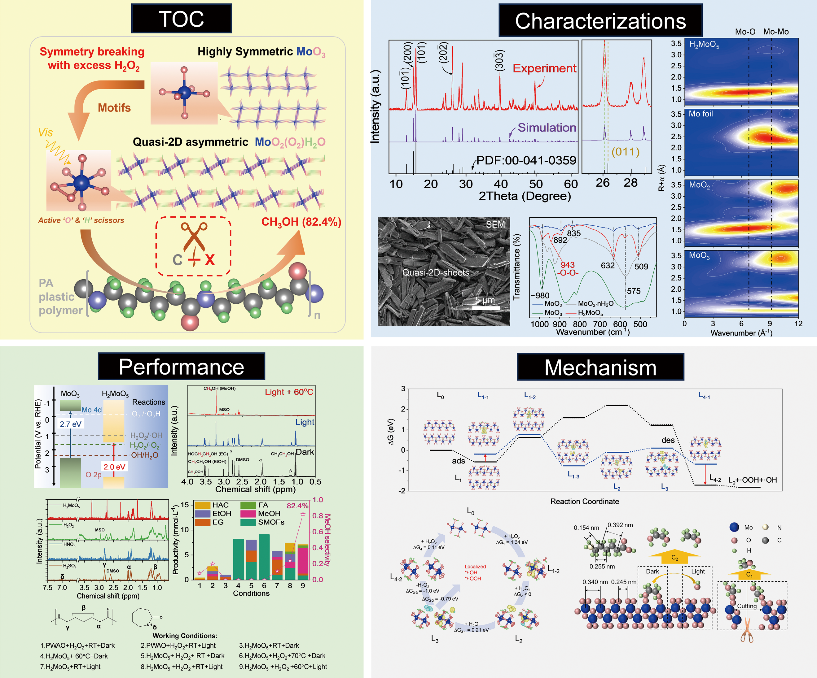 张金龙教授团队深耕光催化领域,开发了基于过渡金属过氧化物的水相光催化方法,通过引入过氧化氢(H2O2)调控催化剂的结构,诱导了不对称性的钼-氧(Mo-O)单元的形成,制备出具有准二维片状晶体结构的过氧钼酸(H2MoO5)催化剂。该催化剂与过氧化氢进一步作用形成了高效“假液相”催化体系。在可见光照射下,该催化体系能够通过配体到金属的电荷转移过程,与H2O2相互作用形成局部自由基(如·/*OH和·/*OOH),从而精准切割聚酰胺塑料中的C-X键(X = C, H, N),最终生成低碳醇类化合物。同时,催化剂表现出Lewis酸性,加速了可溶性聚酰胺低聚单体的形成。实验结果显示,在1 M H₂O₂、60°C的温和条件下,该催化体系实现了82.4%的甲醇选择性,展现出优异的催化性能。此外,该催化剂还表现出良好的循环使用性能,经过多次反应后仍能保持较高的催化活性。该研究不仅为聚酰胺塑料的化学回收提供了一种高效、环保的新方法,还为其他类型塑料废弃物的高效转化提供了新的思路。