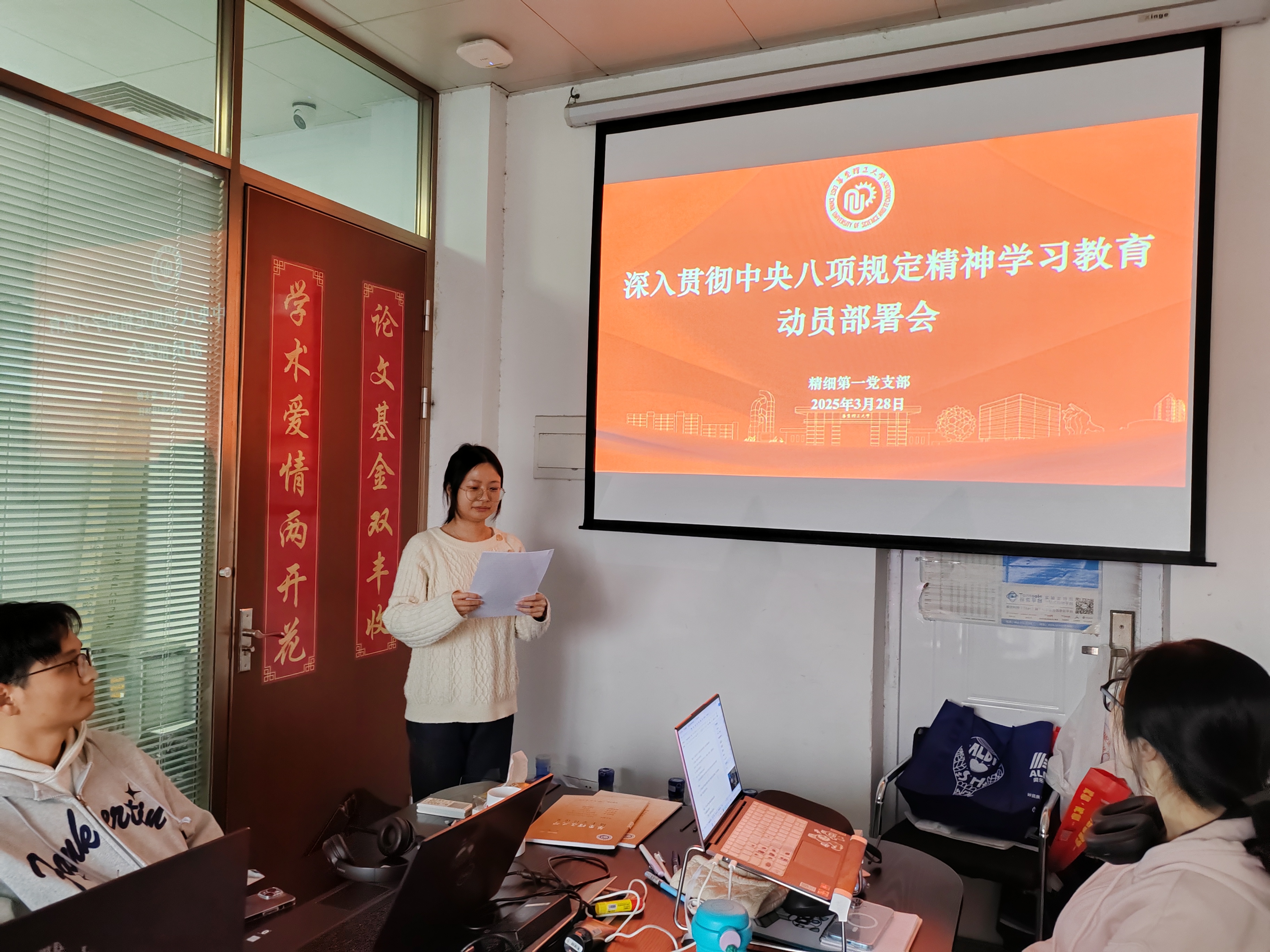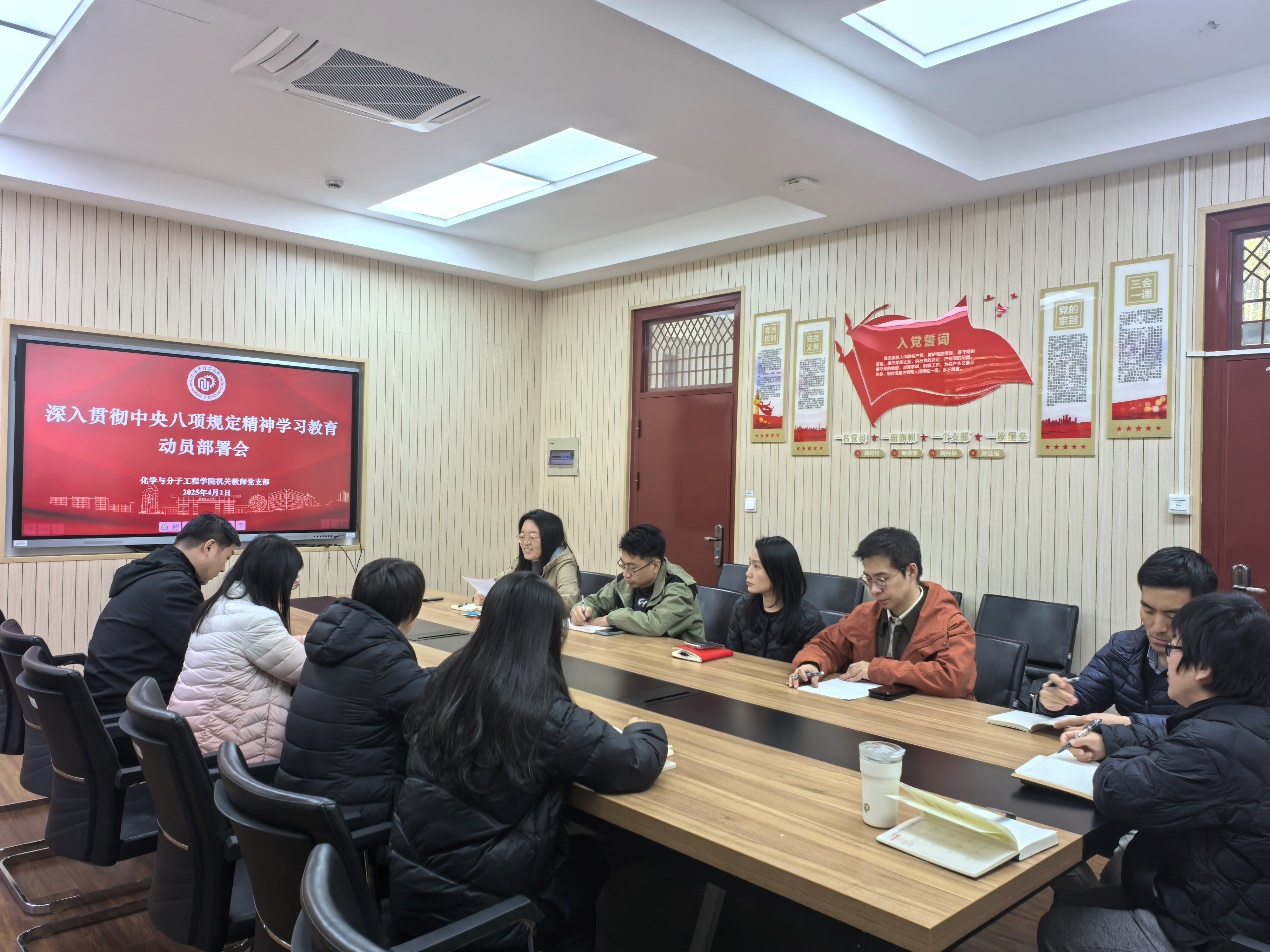 4月1日,分析化学党支部召开深入贯彻中央八项规定精神学习教育动员部署会。会上,支部书记夏玮传达了学院关于深入贯彻中央八项规定精神学习教育的工作要求,重点解读实施方案,强调将理论学习与支部建设深度融合,夯实纪律作风基础。支部聚焦中央八项规定及其实施细则精神、《习近平关于加强党的作风建设论述摘编》、校第十二次党代会精神三项内容,通过领学与研讨交流结合的方式深化学习成效。与会党员一致表示,将以理论武装强化政治自觉,以纪律底线筑牢思想防线,以个人修养提升支部整体战斗力。