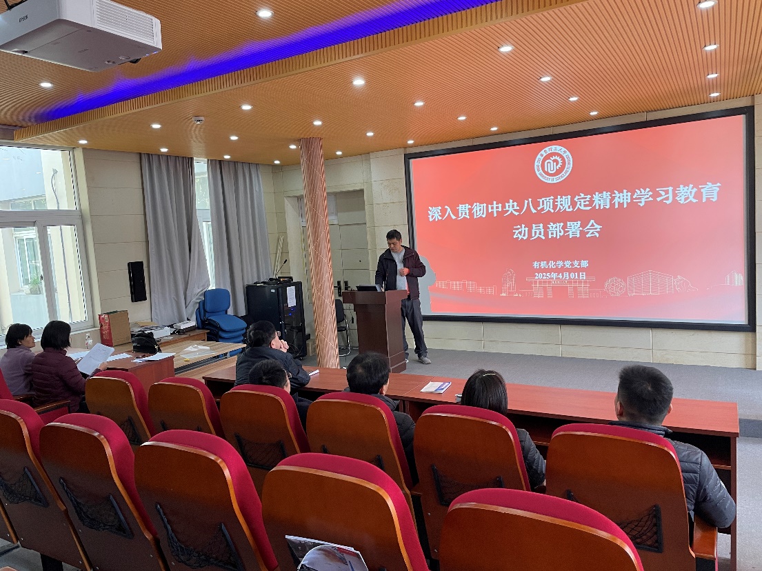 4月1日,有机化学党支部召开深入贯彻中央八项规定精神学习教育动员部署会。会上,支部书记陈宜峰传达了相关文件精神,详细解读了相关实施方案,并对支部后续工作作出了具体部署。随后,陈宜峰围绕支部建设及纪律要求,开展了专题警示教育。支部成员围绕中央八项规定精神及警示教育内容展开了学习研讨,结合工作实际,深入交流学习体会,进一步强化了纪律意识。
