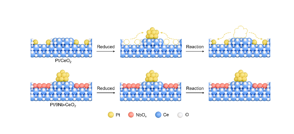 本研究揭示了Pt/CeO2催化剂在丙烷完全氧化反应中的活性衰减机制:Pt纳米团簇在工况条件下转化为催化惰性的单原子“旁观者”是导致失活的根本原因。研究团队提出了一种基于NbOₓ修饰的界面工程的策略,这种策略中,NbOx对Pt物种状态的调控并不是直接与Pt相互作用,而是通过占据CeO2表面的强结合位点,暴露相对弱的Pt锚定位点,从而避免反应产物水诱导的Pt单原子化过程。保留的金属态Pt纳米团簇展现出显著增强的丙烷C─H键解离能力,使丙烷完全氧化反应速率提升37倍,同时改善其稳定性。该界面工程策略同时具有普适性,不仅可以拓展到促进CO氧化反应,还可拓展至其他贵金属催化剂在NbOx修饰CeO2体系中的设计。本研究不仅阐明了工况条件下抗分散及抑制单原子物种生成的重要性,更创新性地提出了通过界面调控保留金属活性团簇的概念,为负载型贵金属催化剂设计提供了新的理论依据。