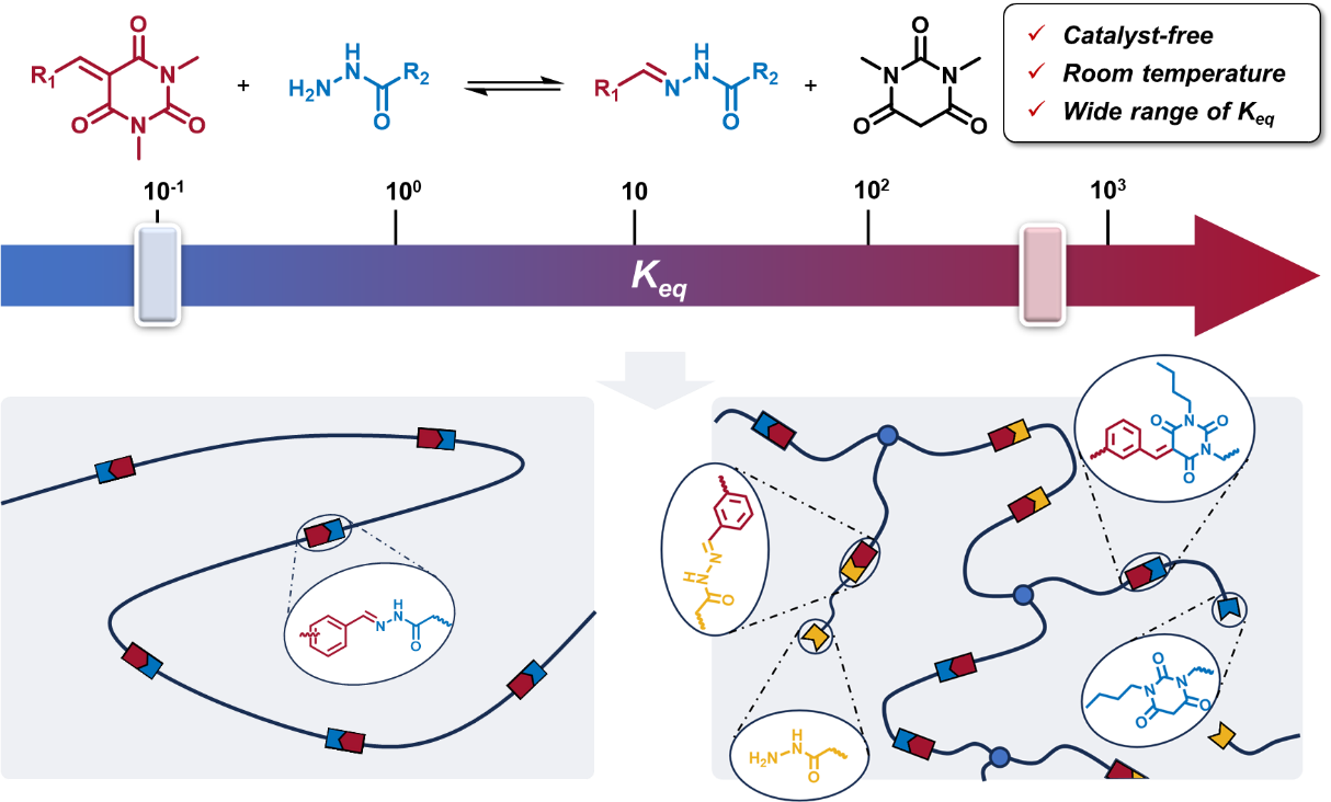 动态共价化学(DCvC)通过可逆共价键的动态重组特性,为动态智能材料设计提供了全新范式。基于动态共价反应(DCRs)的共价适应性网络(CANs)突破了传统热固性材料的不可逆限制,赋予材料自修复、可重塑和闭环回收等革命性功能,成为可持续材料领域的研究热点。然而,现有DCRs多依赖金属或酸碱催化剂,存在毒性残留、稳定性差及催化剂渗漏等问题,从而严重制约材料性能与回收效率。此外,多数动态反应平衡常数(Keq)范围狭窄,难以兼顾高分子量聚合物合成(通常需要高Keq)与快速动力学(通常需要适中Keq),限制了材料力学性能与动态行为的协同优化。因此,开发无催化剂、宽Keq范围的DCRs体系,实现从分子设计到宏观性能的精准调控,成为动态高分子材料领域亟待突破的瓶颈。