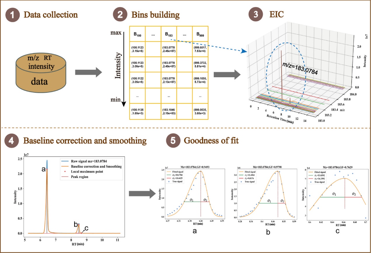 针对液相色谱-质谱技术(LC-MS)数据预处理中的特征提取难题,吴婷课题组创新性地提出局部非对称高斯拟合算法(LAGF)。该算法采用“1 Da数据点分箱”式EIC提取方法,显著提升了特征检测效率,简化了参数调整,降低了峰检测的假阳性,有利于批量代谢组学研究和环境污染物筛查分析。LAGF算法通过自动确定峰中心位点(μ)和峰高(α),同时自适应调整两侧标准偏差(σ1和σ2)来确定色谱峰型,最小化广义双侧非对称高斯拟合的参数数量。相比XCMS、Mzmine等传统工具,该算法在多数情况下展现出更高的特征提取准确性。LAGF算法同时以开源Python代码和交互界面两种形式提供,可便捷地应用于非靶向和靶向LC-MS分析,提升峰检测和化合物鉴定性能。相关研究成果以“Local Asymmetric Gaussian Fitting Algorithm for Enhanced Peak Detection of Liquid Chromatography–High Resolution Mass Spectrometry Data”为题发表在分析化学领域权威期刊Analytical Chemistry上。化学学院硕士生邹盛斯为论文第一作者,吴婷和杜一平为论文通讯作者。