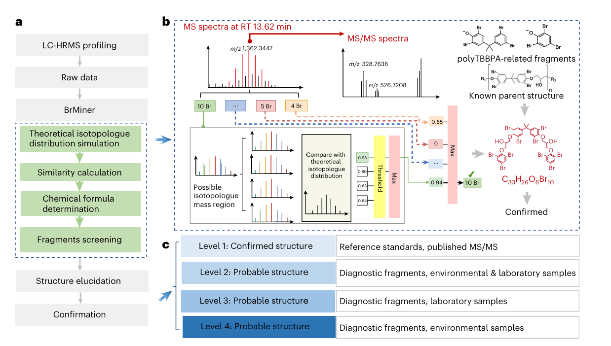 作为传统卤系阻燃剂的“安全”替代品,聚合物阻燃剂已在日常生活和工业生产中得到广泛应用。然而,现有研究尚未系统揭示其环境归趋和毒性效应,相关潜在风险仍存在重大认知空白。针对这一问题,课题组自主研发了基于高分辨质谱数据的溴代污染物非靶向筛查工具BrMiner,在华南典型电子垃圾回收场的环境样品中成功鉴定出76种聚合物阻燃剂的降解产物。课题组与暨南大学陈达教授和南京大学张效伟教授合作,利用拟降解实验和斑马鱼胚胎毒性测试,证实了聚合物阻燃剂在环境降解过程中会产生更高毒性的转化产物,为完善阻燃剂环境风险评估体系提供了重要依据。研究成果以“Environmental impacts of polymeric flame retardant breakdown”为题发表在Nature Sustainability上。化学学院已毕业博士研究生熊訚然为论文共同第一作者,吴婷为论文共同通讯作者。