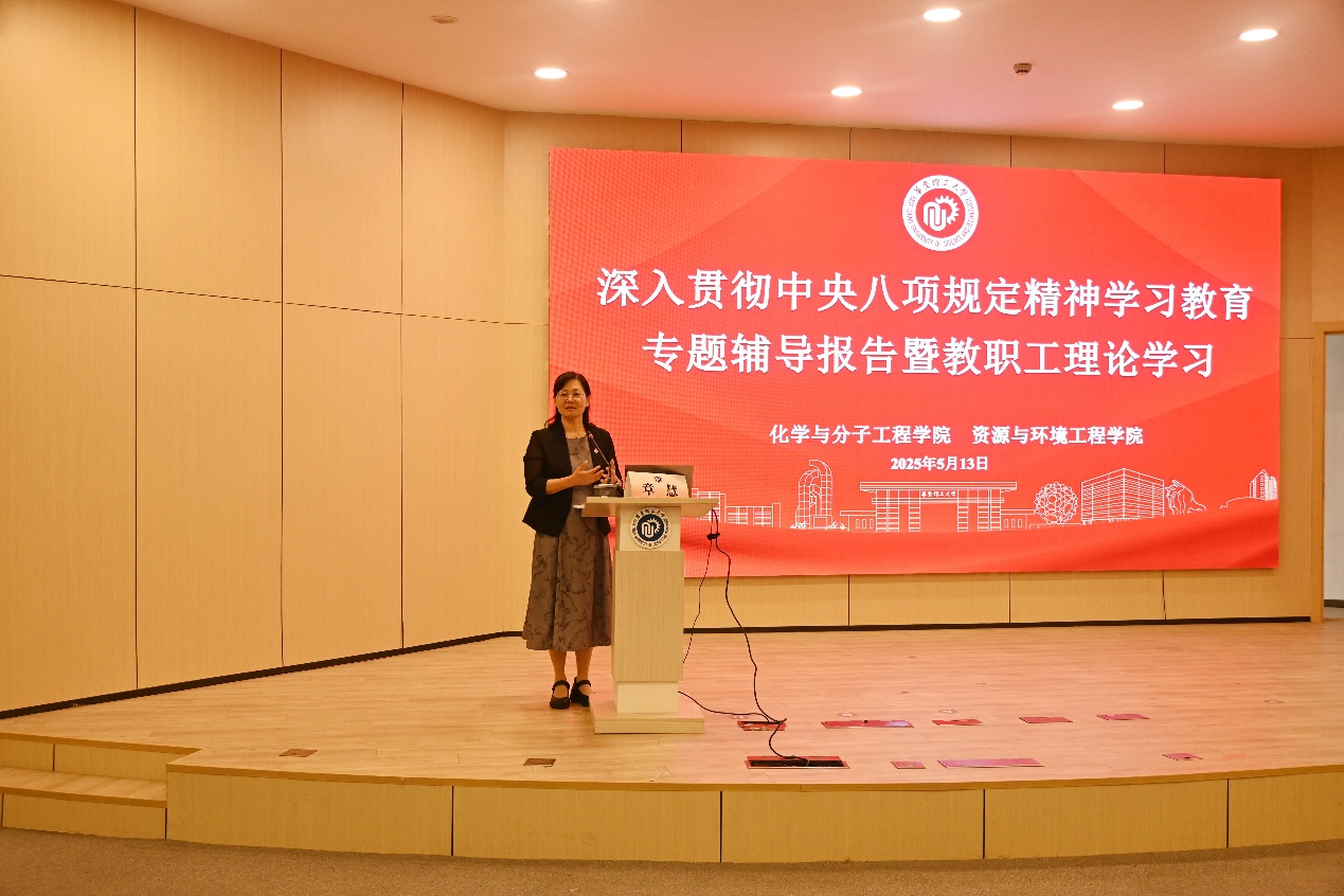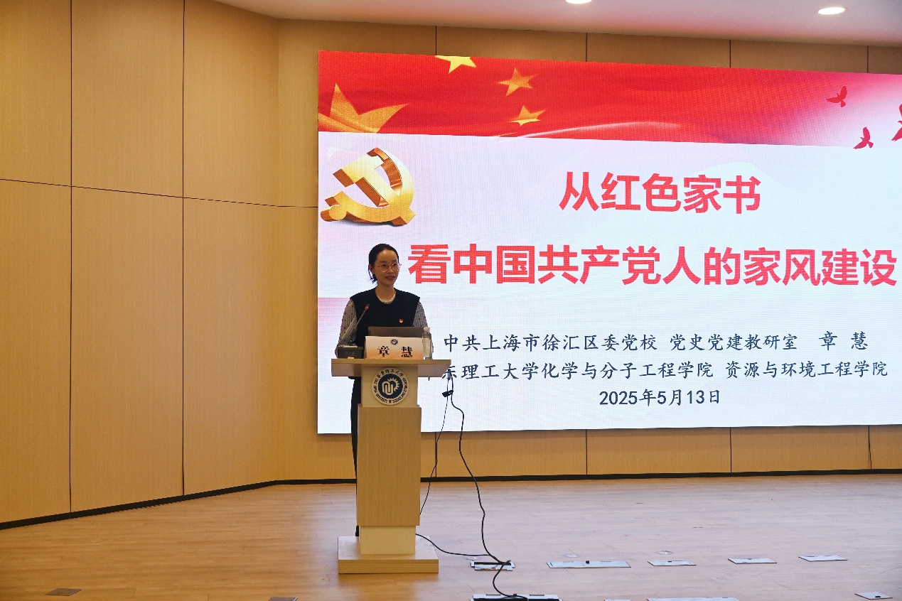 为进一步推进深入贯彻中央八项规定精神学习教育,5月13日下午,化学与分子工程学院、资源与环境工程学院联合举办了深入贯彻中央八项规定精神学习教育专题辅导报告暨教职工理论学习。徐汇区委党校党史党建教研室教师章慧应邀作了题为“从红色家书看中国共产党人的家风建设”的专题报告。化学学院和资环学院领导班子成员、教职工及学生党员代表参会。会议由化学学院党委书记张文清主持。