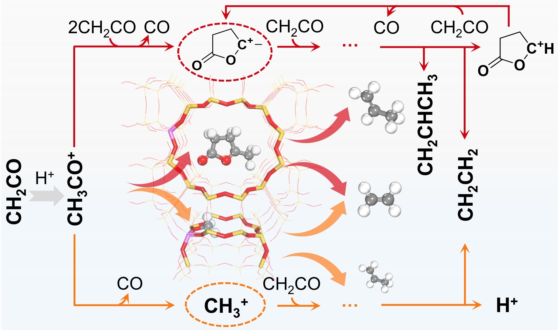 双功能金属氧化物-分子筛(OX-ZEO)催化剂因其具有将合成气转化为低碳烯烃的优异选择性而受到广泛关注。其中,分子筛组分的存在能够打破传统费托合成中的Anderson-Schulz-Flory(ASF)分布,从而实现低碳烯烃的高选择性生成。研究表明氧化物上可以生成乙烯酮(CH2CO),它作为关键的反应中间体扩散到分子筛中,进一步转化为低碳烯烃。然而,由于分子筛孔道结构复杂且活性位点多样,CH2CO在原子层面上如何转化为低碳烯烃的微观机制仍然模糊且存在争议,阻碍了OX-ZEO催化剂的优化。
