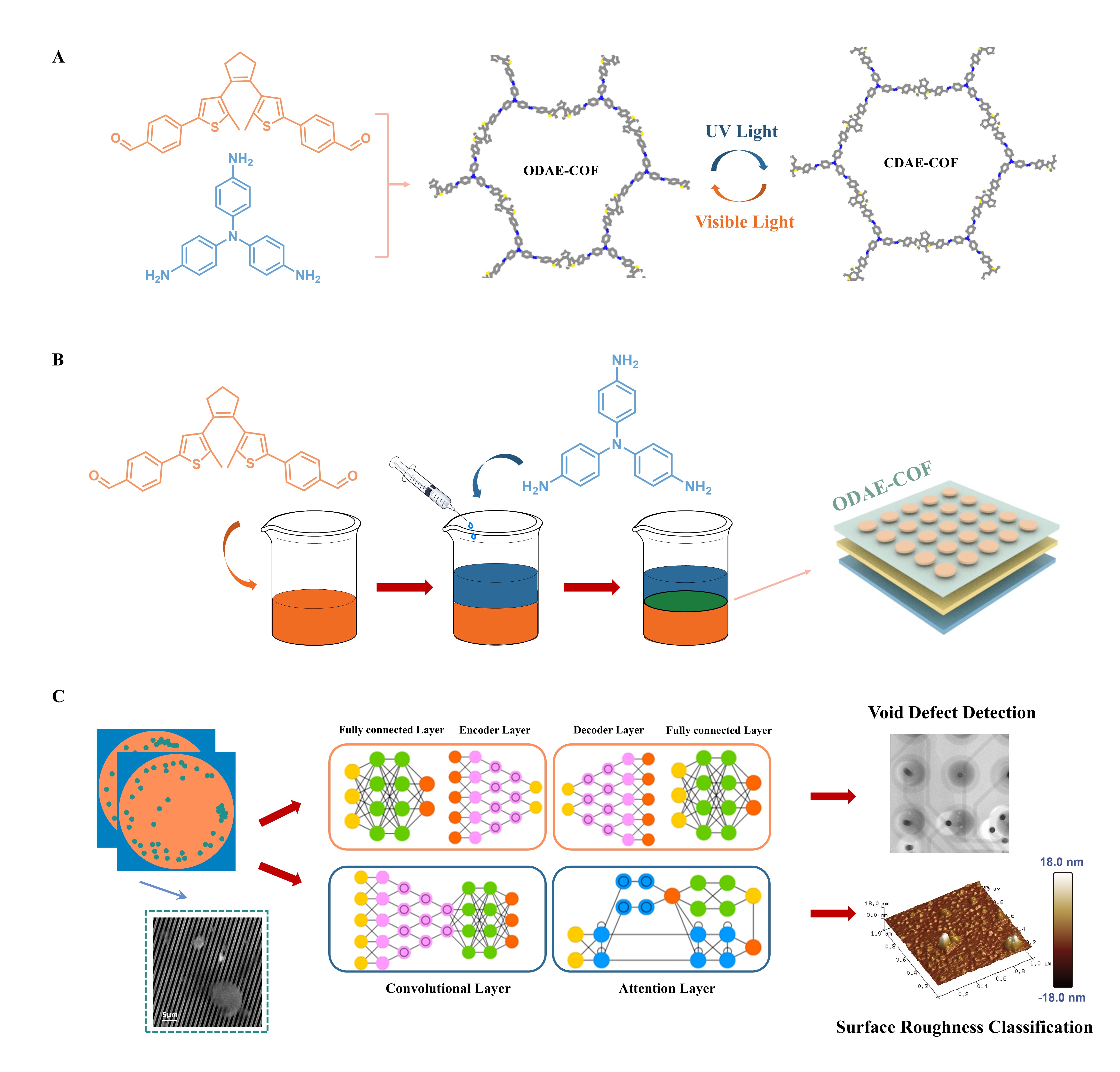 智能传感团队报道了一种大面积的刺激响应型共价有机框架薄膜(ODAE-COF),并以此薄膜材料为活性层制备了具有光电双响应特性的忆阻器,进一步开发了基于忆阻器的新型边缘计算系统。该系统集成了传感单元和数据处理模型,分别用于晶圆的空洞缺陷检测和表面粗糙度分类。传感单元模型包含两个网络:首先在图像增强网络中,利用忆阻器的光响应性进行去噪和特征提取;接着,信号被传输到一个由输入、编码器、解码器和输出模块组成的神经网络,用于精确定位缺陷。通过对400幅晶圆的X射线图像进行测试,证明了空洞缺陷检测的有效性。数据处理模型包含一个图像注意力模块、一个特征卷积模块和一个概率映射模块,所有模块均由64种光电导态的忆阻器构成。该模型在晶圆表面粗糙度分类中实现了优异的表现,平均精度超过90%。