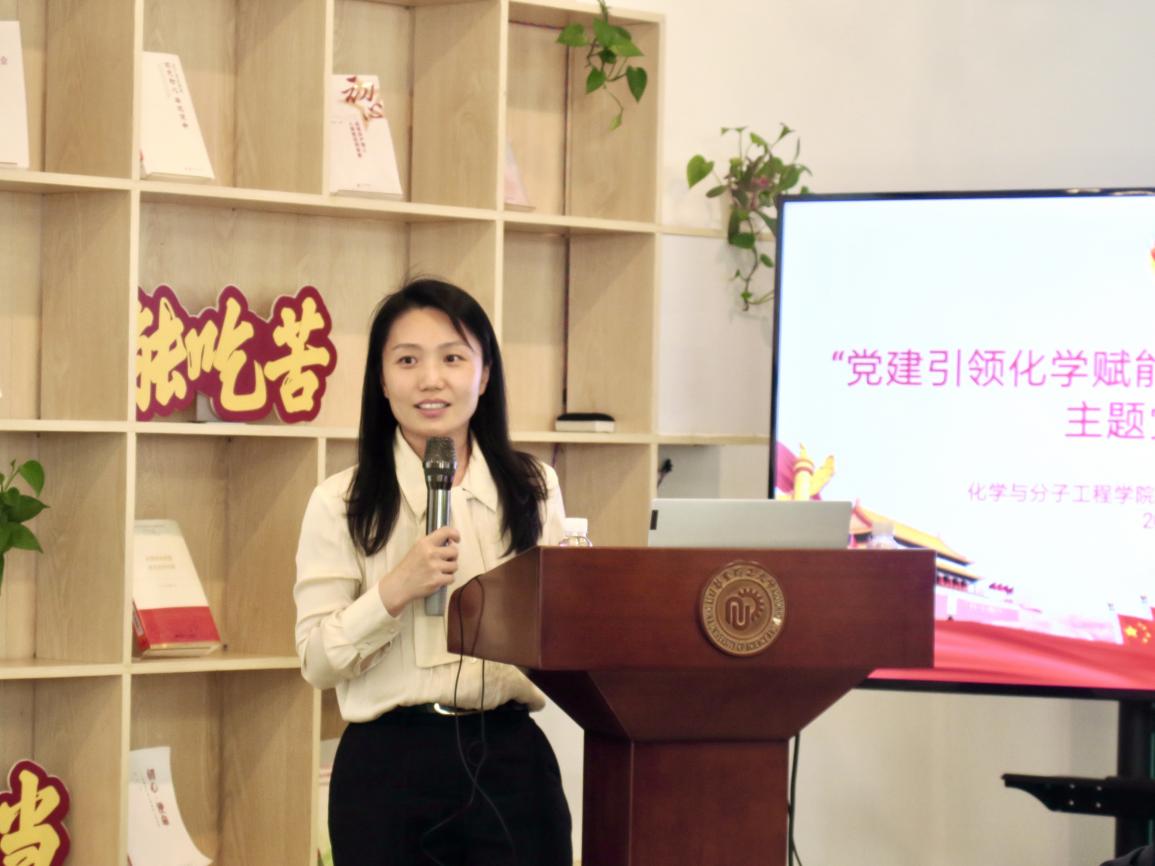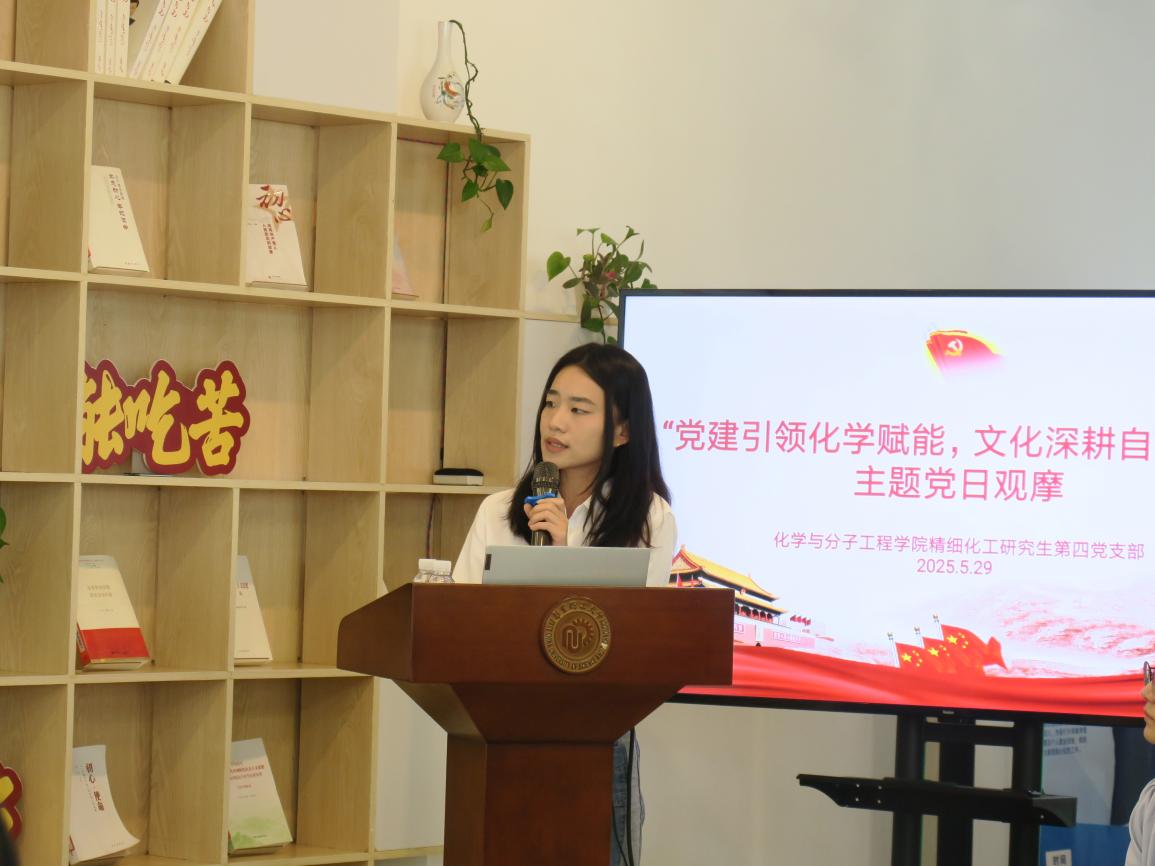 为深入贯彻落实学校第十二次党代会精神,推进党建和学科建设深度融合,深化“专思创”党建育人模式,5月29日下午,化学与分子工程学院精细化工研究生第四党支部在图书馆明德书房举办了“党建引领化学赋能,文化深耕自信铸魂”主题党日观摩活动。化学学院党委副书记兼纪委书记吕遐、王利民教授及精细化工研究生第四党支部学生党员参加了活动。数学学院、物理学院、外国语学院、离退休工作处、图书馆等师生党支部书记和化学学院学生党员观摩了活动。活动由党建指导老师聂婷主持。