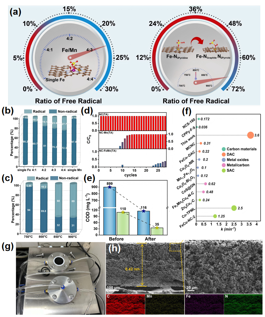 基于过硫酸盐的高级氧化技术(PS-AOPs)因其快速的降解速率以及对芳香族化合物的选择性而在废水处理领域被广泛应用。然而,如何精确控制PS-AOPs中的自由基和非自由基路径一直是一个阻碍其规模化应用的关键科学问题。本研究通过构建不同铁/锰比以及不同配位氮物种的双金属单原子催化剂,实现了自由基/非自由基路径的有效调控(图1a)。一方面,双金属单原子催化剂中铁/锰比例的改变会影响PMS在催化剂表面的吸附模式,从而延长PMS中的O-O键,进一步促进自由基的生成,使得自由基贡献率从1.82%调节至27.70%(图1b)。另一方面,催化剂的煅烧温度会改变金属配位的氮物种类型,这种调控使得自由基贡献率在5.96%至69.00%范围内调节(图1c)。得益于双金属单原子催化剂的稳定性和活性,NC-FeMn0.3(TA800)在经历22次循环后仍能实现目标污染物100%去除率,显著优于NC(TA800)和NC-Mn0.3(TA800)(图1d)。此外,同时包含自由基和非自由基路径的NC-FeMn0.3(TA800)/PMS体系对高浓度和低浓度的COD废水均表现出显著的处理效果(图1e)。相较于目前已报道的不同类型的催化剂,NC-FeMn0.3(TA800)表现出显著增强的催化性能(图1f)。将NC-FeMn0.3(TA800)固定在商业化的PVDF膜上,所得的NC-FeMn0.3(TA800)/PVDF膜直径为3.1 cm,厚度为420 μm,具有多孔表面和相互连接的堆叠层,Fe和Mn元素在氮掺杂碳材料结构中均匀分布(图1g和1h),可见其具有良好的实际应用潜力。