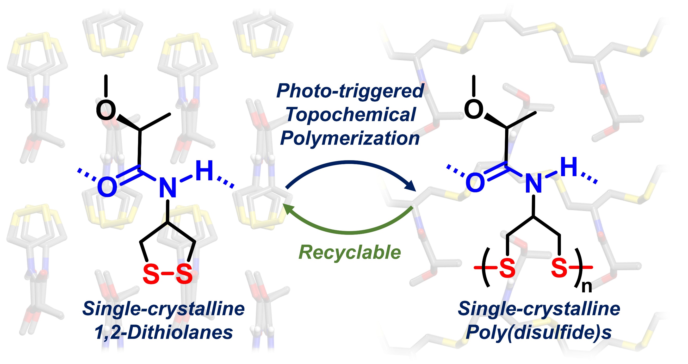 动态高分子是一类由可逆化学键(例如非共价键、动态共价键)连接形成的聚合物,由于其本征动态性,近年来在自修复材料、可循环聚合物、智能材料、可穿戴柔性材料等方面展现应用前景。然而,在体系中低键能、可逆断裂的动态共价键,往往使得聚合物的精准合成相比于经典高分子更加挑战。例如,以二硫键为动态连接方式的聚二硫材料,是一类近年来新兴的动态高分子,但现有的可控聚合技术主要依赖于溶液相的碱催化的阴离子开环聚合或酸催化的阳离子开环聚合,其聚合转化率受限于热力学驱动力的限制,难以突破80%,且立体规整度难以精准调控,得到的聚合物样品往往呈现非晶态、或低结晶性,限制了该类聚合物向结晶型材料的发展和应用。