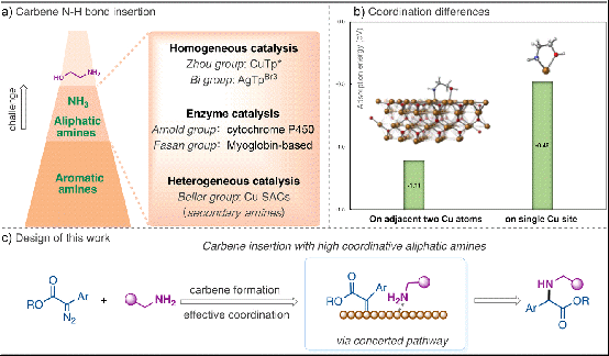卡宾N-H键插入反应是构建C-N 键的重要策略,已被证实可在多种胺类底物中实现高产率与高选择性转化。然而,脂肪胺因具备强配位能力,易导致金属催化剂失活,这一关键问题严重限制了其应用。目前,解决该难题的方法主要依赖大位阻配体的引入或工程酶提供的多重结合环境,但这些策略在催化剂回收利用等方面存在一定局限。异相金属催化近年来逐渐在卡宾 N-H 键插入反应领域展现出一定的应用潜力,已在芳香胺的催化中取得良好效果,但针对脂肪胺的催化研究仍十分有限。