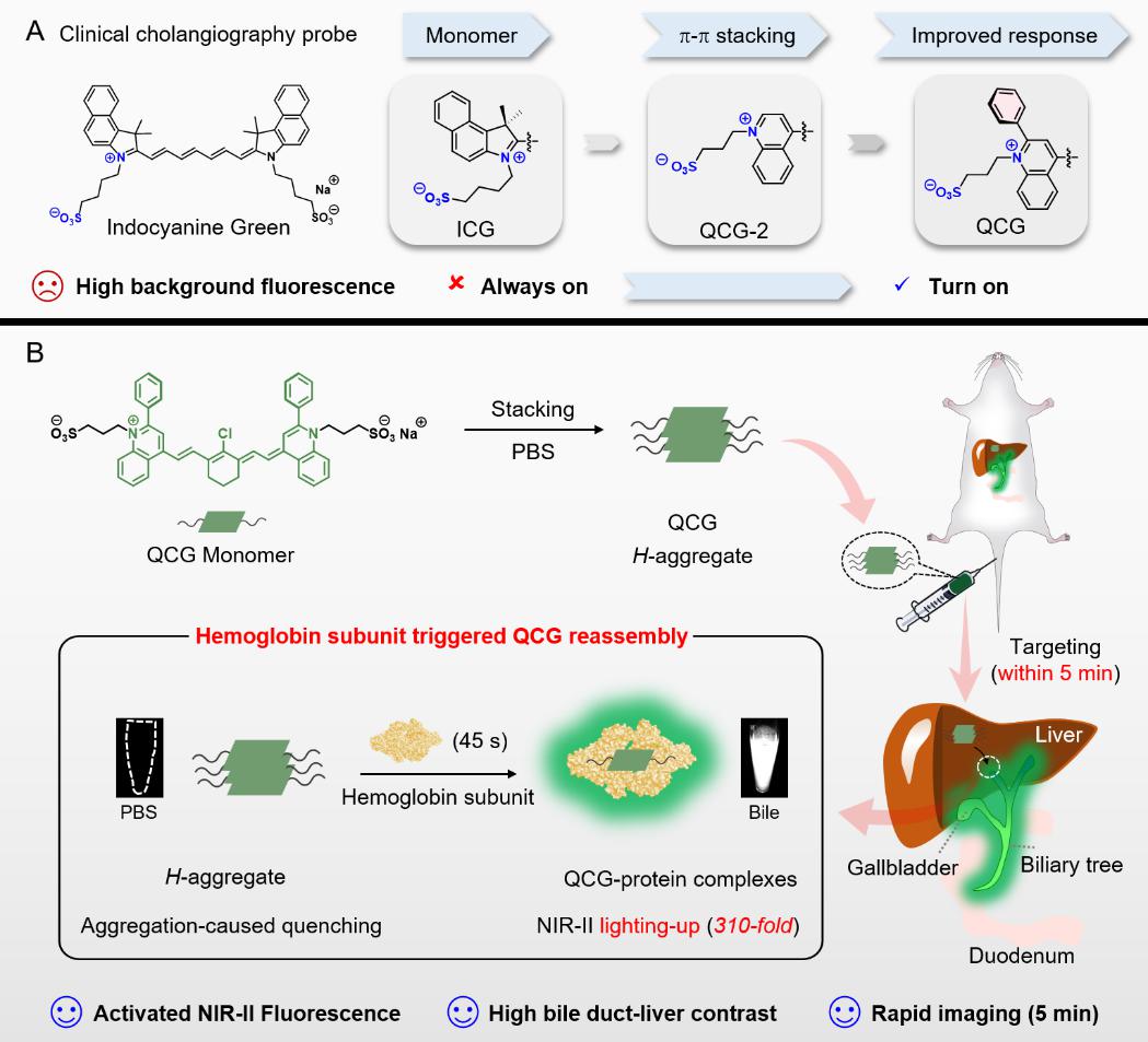 团队创新性提出了由靶标蛋白触发的分子探针原位重组装新策略。该策略基于近红外染料分子平面性强、易发生 π–π 堆积的结构特征,首先将染料预组装为荧光淬灭的纳米聚集体;随后在靶标蛋白特异结合的作用驱动下,初始聚集体发生解离,并进一步重组为热力学上更稳定的染料–蛋白复合物,从而实现“关—开”式的特异性激活信号。研究团队基于分子工程化设计思路,成功构建了胆汁特异性激活的近红外喹啉菁(QCG)荧光成像造影剂,其成像性能显著优于FDA临床批准的胆道造影剂吲哚菁绿(ICG)。