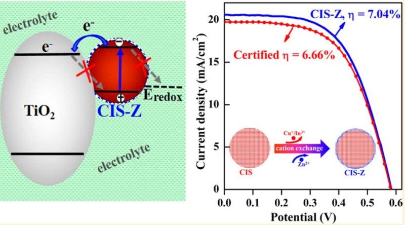 近日,365英国上市集团官网化学学院钟新华教授课题组在量子点太阳电池领域再次取得重大突破,将去年由该课题组创造的量子点敏化太阳电池光电转换效率(η)记录6.67%提升到7.04%,相关研究成果“High-Efficiency ‘Green’ Quantum Dot Solar Cells” 在《美国化学会志》(Journal of the American Chemical Society)上发表(http://pubs.acs.org/doi/pdfplus/10.1021/ja504310w)。该工作主要由博士研究生潘振晓在赵珂、王靳等协助下完成。 近年来,半导体纳米材料(量子点)由于其优异的光电性能,在光电转换领域引起人们日益增强的兴趣,并有潜力发展成为外量子效率超过100%的第三代太阳电池。遗憾的是目前被广泛采用的量子点材料中,大部分都含强毒性重金属元素Cd或Pb,这无疑制约了其商业应用价值,而不含Cd、Pb的“绿色”量子点材料所组装的电池效率大多低于3%。因此,开发高性能不含Cd、Pb“绿色”量子点太阳电池对其商业应用至关重要,同时在技术上也是一个严峻的挑战。基于“绿色”材料的理念,该课题组设计合成了CuInS2 (CIS)量子点,并通过阳离子交换途径,在CIS量子点表面径向生长宽能带ZnS壳层构筑出CuInS2/ZnS (CIS-Z)核/壳结构量子点,以减少量子点的缺陷态。这样可以抑制、降低光生电子发生在缺陷态的复合,从而提高电池的光电压、光电流,并最终提高电池效率。实验结果表明,基于CIS-Z量子点太阳电池的η值可从CIS量子点电池的5.05%提高到7.04%(官方认证效率为6.66%),这一数字不仅是所有类型“绿色”量子点太阳电池η值的新纪录,同时也是所有量子点敏化太阳电池η值的新纪录。所有论文评审人对该工作的重要性(significance)、创新性(novelty)均给出了最高的评价(Top 5%)。