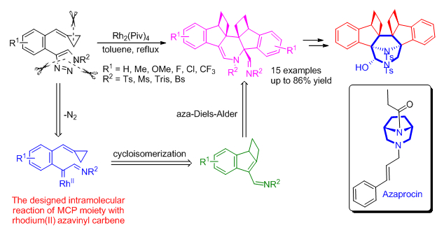 此外,施敏教授课题组在所发展的小环张力分子在路易斯酸以及金催化下的开环/关环串联反应体系(Acc. Chem. Res. 2012, 45, 641-652; Acc. Chem. Res. 2014, 47, 913-924)的基础上,通过铜(I)催化的叠氮-炔的点击化学环加成,成功地合成了多种三氮唑取代的亚甲基环丙烷底物。该底物在Rh(II)催化作用下,能够发生串联的脱氮,环异构化和杂Diels-Alder反应,一步高效地构建多环含氮杂环化合物。该反应具有良好的底物适用性,同时也展现了Rh(II)催化下不同骨架的亚甲基环丙烷(MCPs)与三氮唑的反应多样性。所得产物能够发生多种类型的转化得到几类diazabicyclo[3.2.1]octane衍生物,特别是所得的3,8-diazabicyclo[3.2.1]octane衍生物与镇痛药azaprocin具有相同的双氮桥环骨架(Scheme 2)。该工作由化学院陈凯同学主要完成,朱子忠,张永生,胡旭波,金义涛同学协助完成。