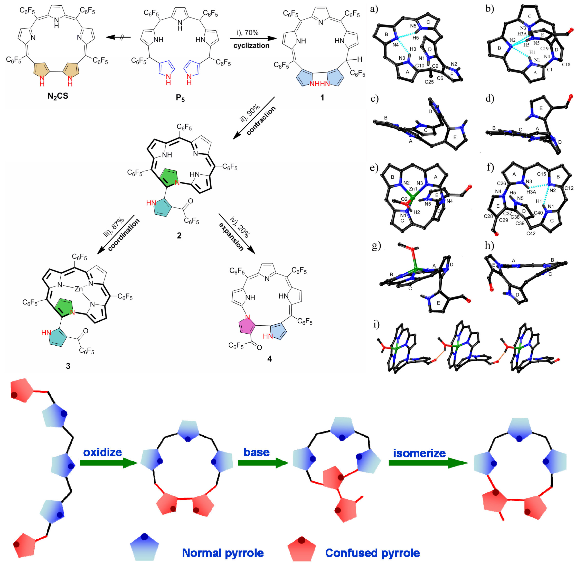 大环结构在自然界和人工功能体系中广泛存在。其中最突出的代表就是含四个吡咯单元的卟啉,它具有丰富的光电性能。近年来,发展具有特殊结构和性能的新型大环化合物,特别是卟啉类似物  异卟啉 (porphyrinoid) 的研究,引起了广泛关注。该文章将两个特殊的高活性 “混乱” 吡咯单元 (N-confused pyrrole) 配置到一个线性五吡咯分子的两端,并进行氧化环化。得到了含五个吡咯单元的新型大环结构,并在不同反应条件下对其依次进行缩环和扩环反应,得到新型四吡咯和五吡咯大环。其中,前者锌配合物荧光峰位于近红外区 736 nm 处,可望发展成一类新型荧光增强型锌离子探针。上述四个大环化合物均用单晶结构进行了表征。