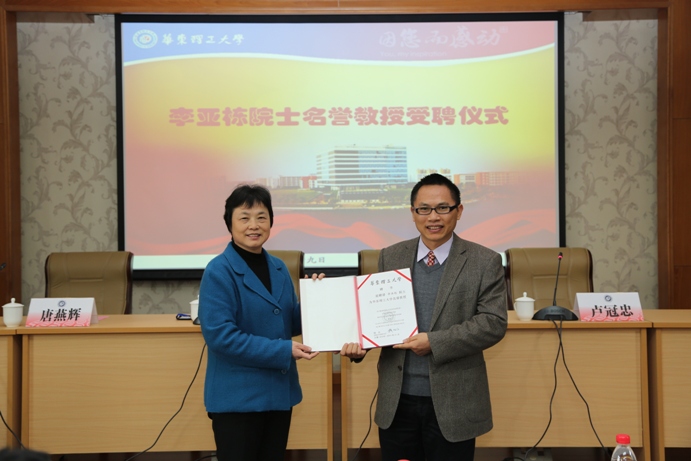 11月19日,中国科学院院士李亚栋教授受聘365英国上市集团官网名誉教授仪式在和平楼第二会议室隆重举行。副书记、副校长马玉录、国家973计划项目首席科学家卢冠忠、化学与分子工程学院分党委书记唐燕辉等出席了受聘仪式。授聘仪式由卢冠忠主持。卢冠忠介绍了李亚栋院士的学术成就,马玉录代表学校致辞,为李亚栋院士颁发了名誉教授聘书并佩戴校徽。