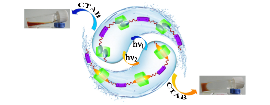 在这个背景下,田禾院士、曲大辉副教授以及博士研究生张琪伟等人创新性地提出了一个“光控可逆切换聚合物”的新概念。他们利用环糊精与香豆素衍生物之间的可以形成1:2的主-客体络合物,同时香豆素衍生物可以在外界光化学刺激下发生可逆的光二聚化学反应,构建了一个光控的功能性聚合物(如下图所示)。该聚合物可以在光照下,在基于共价键骨架的聚合物和超分子聚合物之间进行可逆的转换。同时,在一类表面活性剂的辅助下,该体系还可以实现溶液和凝胶的可逆转化。因此,它不再是独立地属于某一类聚合物,而是根据人们的实际需要,可以灵活地切换状态来实现不同的功能。正如Nature杂志中写到的:“他们把两大类聚合物结合在了一起”,从而在单一、可调控体系中,实现了综合传统共价聚合物和新型超分子聚合物的特点的目标。因此,这一开创性的工作兼具理论意义和应用价值,对聚合物科学的发展具有促进作用。