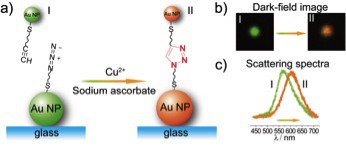 我院在龙亿涛科研团队在单颗粒水平上监测有机化学反应这一研究方面取得重要进展,在《德国应用化学》国际版Angew. Chem. Int. Ed.发表了重要研究成果(“Plasmon Resonance Scattering Spectroscopy at the Single-Nanoparticle Level: Real-Time Monitoring of a Click Reaction” DOI: 10.1002/anie.201301930)。科研人员在自主搭建的多功能纳米光谱分析平台上,利用金纳米颗粒等离子共振散射光谱的耦合特性,巧妙地通过点击化学(Click Chemistry)将两种纳米粒子连接,使得金纳米粒子的共振散射峰发生位移,并伴有明显的颜色变化,从而实现点击化学反应的实时灵敏在线监测。同时,由于单纳米颗粒的传感器具有很高的灵敏度,该方法还可应用于在水相中定量检测Cu2+,检测限达到0.1 nM。
