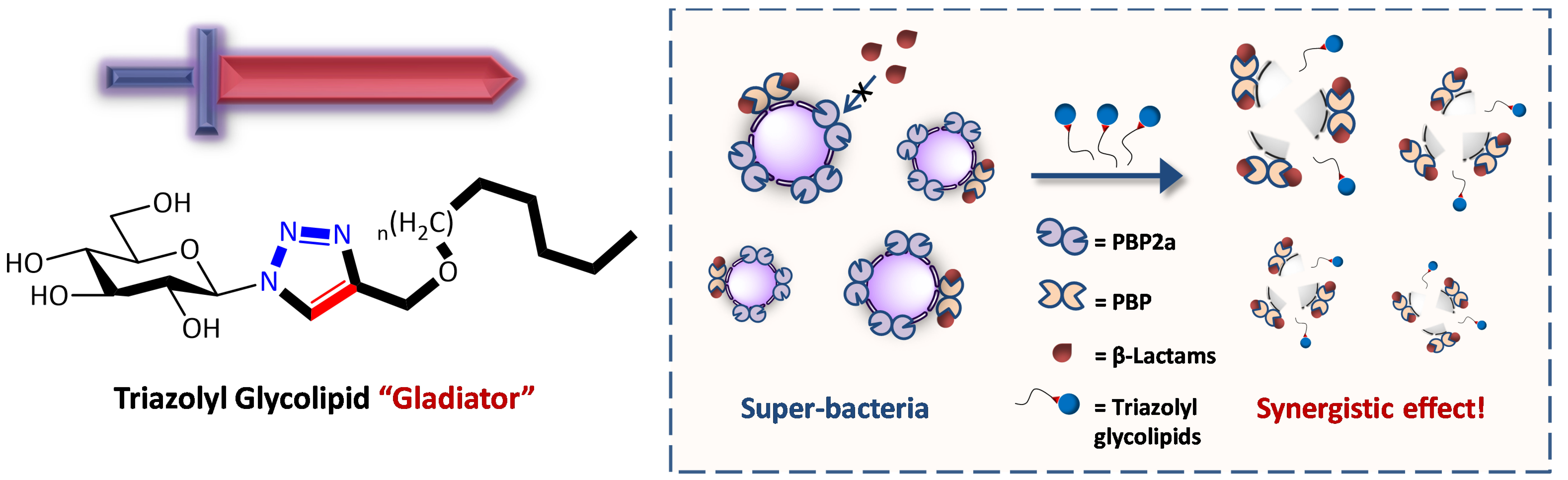 化学与分子工程学院贺晓鹏团队与中国医药工业研究总院陈代杰团队合作发展了一系列基于“点击化学”高效构建的三氮唑偶联糖脂衍生物,发现此类化合物的少量添加可大幅度恢复MRSA对于一系列β-内酰胺类抗生素的药物敏感性,活性提升最高可达256倍。初步机制研究发现,此类糖脂化合物与β-内酰胺类抗生素联用可降低一种耐药蛋白在MRSA中的表达。此外,构效关系研究发现不含三氮唑的糖脂衍生物未显示协同增效作用,推测由于三氮唑环可促进糖脂的胶束形成能力,从而增加了药物的包裹与靶向释放效果。研究人员将就这一结果开展进一步的结构优化与机制解析。