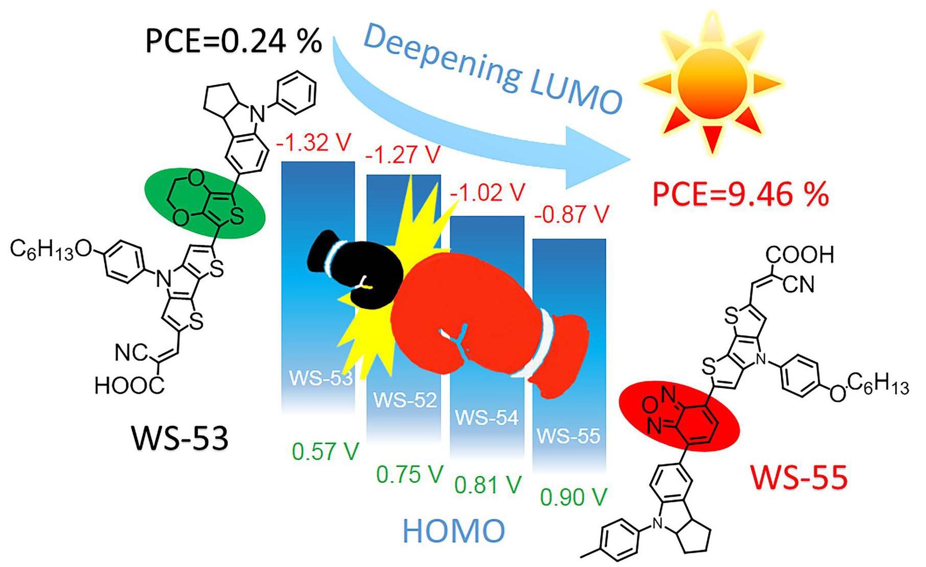 另一方面,染料分子的 HOMO–LUMO 能级必须有效匹配,以保证高效电子注入和染料再生。但目前大多纯有机染料过高的 LUMO 能级造成能量的 “浪费”。针对该问题,在传统染料分子基础上,突破性地定向调控LUMO能级,非常有效地确保染料光捕获波长、能级匹配、电子注入平衡,为发展D–A–π–A 模型染料提供了源头创新思路,该结果发表于英国皇家化学会《化学科学》 (Chemical Science, http://pubs.rsc.org/en/content/articlelanding/2015/sc/c5sc02778k#divAbstract)。
