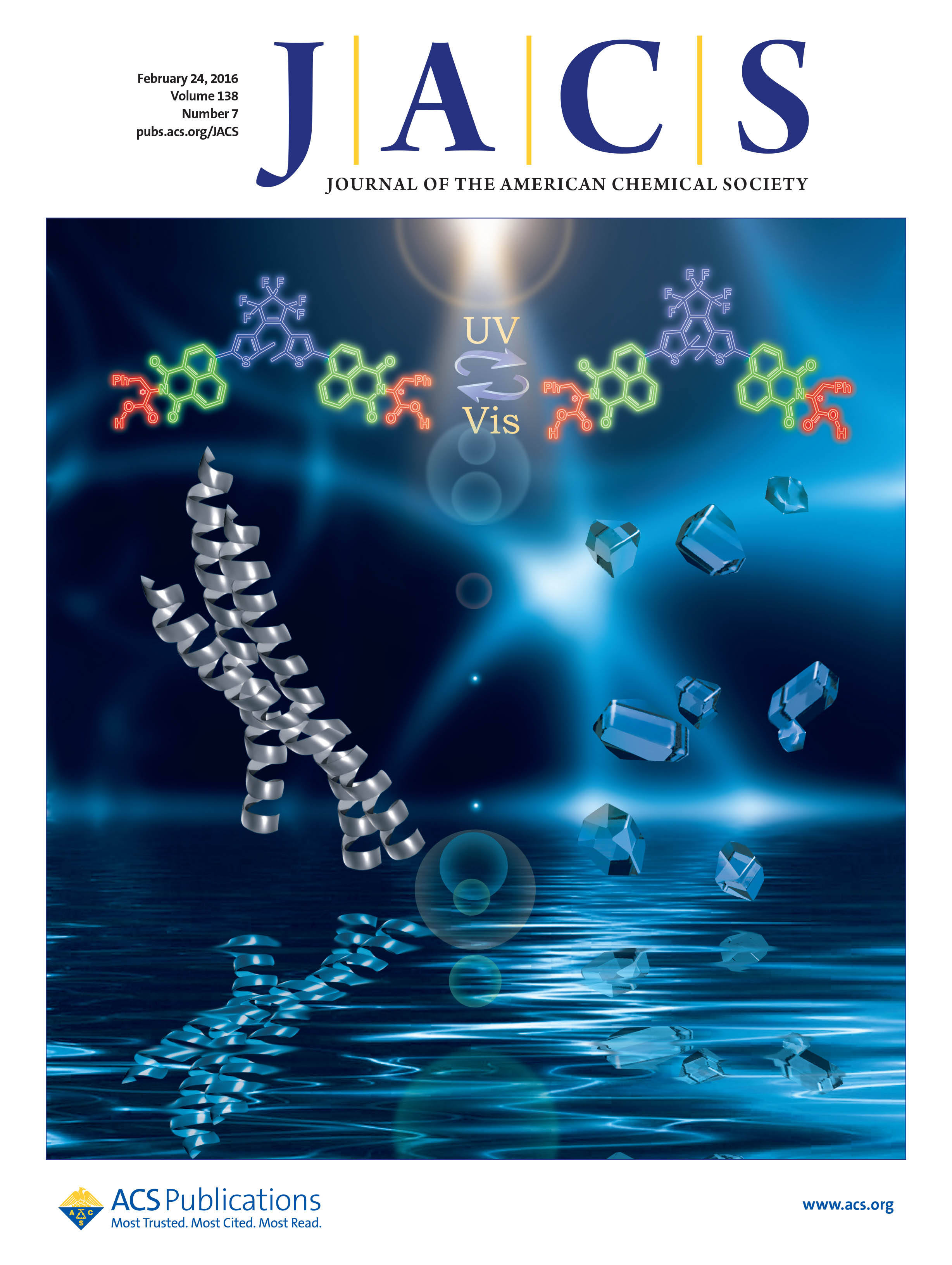 螺旋自组装体系的构建一直是生命科学和材料科学的研究热点。最近,化学学院的朱为宏课题组在光可控螺旋自组装纳米结构的研究取得了突破性进展。《美国化学会志》(JACS)最近以期刊封面的形式报道了该工作“Enabling Light Work in Helical Self-Assembly for Dynamic Amplification of Chirality with Photoreversibility” (J. Am. Chem. Soc. 2016, 138, 2219−2224),文章链接:http://pubs.acs.org/doi/abs/10.1021/jacs.5b11580,并被JACS进行亮点报道(Spotlight: http://pubs.acs.org/toc/jacsat/138/7, J. Am. Chem. Soc. 2016, 138, 2063−2063)。
