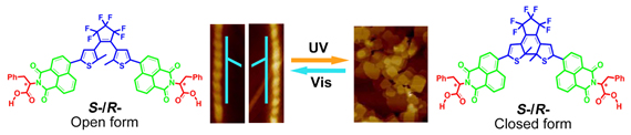 自然界中,光和手性氨基酸是普遍存在的物质,在植物和动物的生物功能表达方面具有重要的作用。该工作巧妙地利用光控二芳基乙烯单元,将α-苯丙氨酸引入萘酰亚胺荧光团,构建了一个多功能单元的光控螺旋自组装体系。该体系的开环体构型在手性氨基酸基团分子间氢键的作用下,突破性地实现了类似生命体的超分子螺旋自组装体系,实现了手性放大效应。在紫外光照下,开环体发生闭环反应,由于闭环体结构柔韧性的缺失,螺旋形纳米结构解体,圆二色信号消失,同时荧光淬灭。在可见光(>510 nm)光照下,闭环体发生光开环反应形成原来的开环体,螺旋形纳米结构重新生成,圆二色信号得到恢复。因此,该体系可逆地实现了螺旋结构组装/解体、荧光开/关、以及圆二色信号的光调控,对生物体内DNA和蛋白质分子间手性交流方面有着极其重要意义。