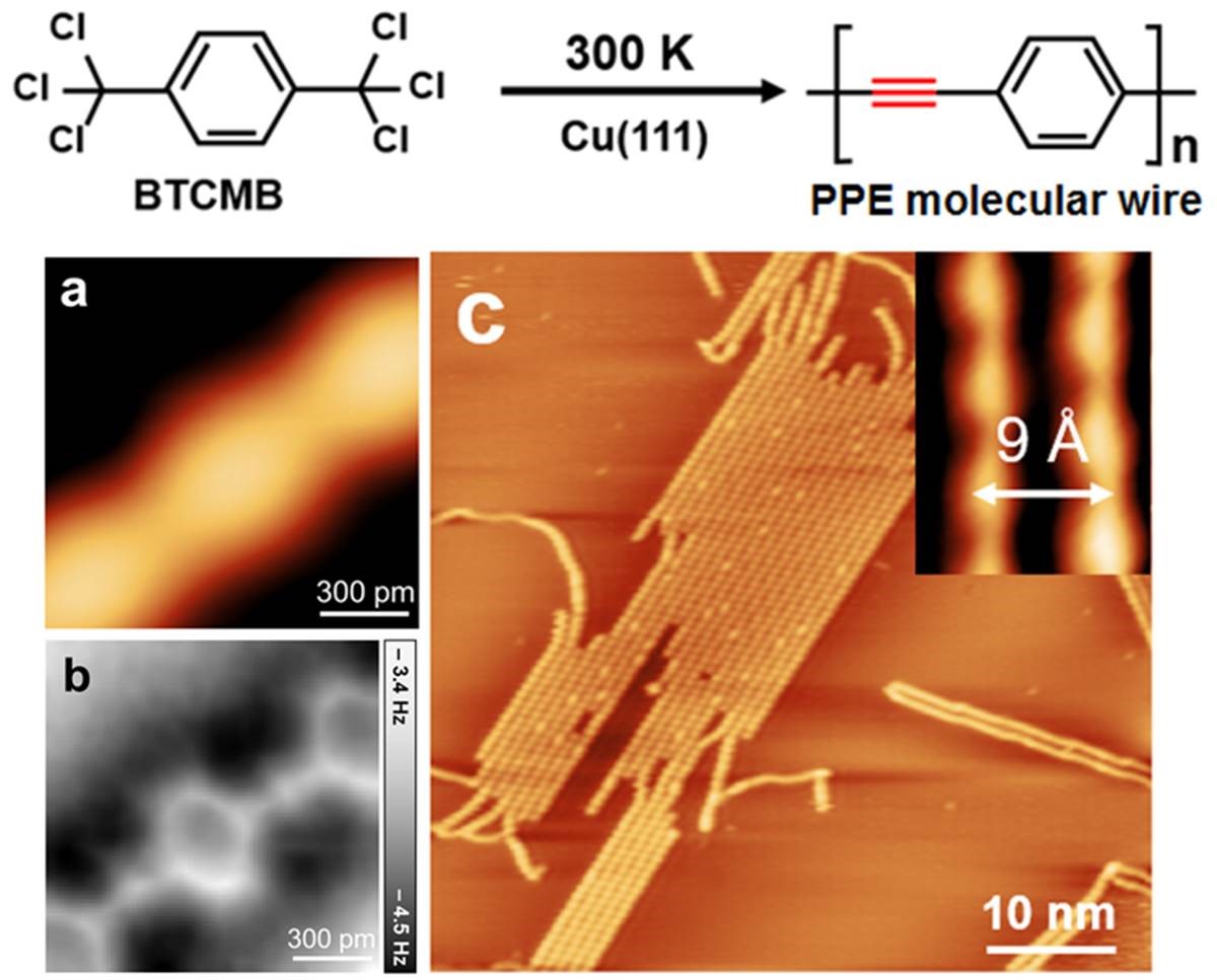 该课题组成功发展出通过三氯甲基偶联原位构建C≡C键的反应,在室温下即可在洁净的Cu(111)表面原位生成通过一般的表面反应难以获得的poly(p-phenylene ethynylene)分子线(图一)。另外,通过与裘晓辉课题组合作,使用非接触原子力显微镜(nc-AFM)和DFT计算模拟对三氯甲基偶联反应的机理进行研究发现:在逐渐升高温度时(5-70 K),三氯甲基会逐个脱掉氯原子,依次生成被Cu基底稳定的苄基自由基中间体、卡宾中间体和卡拜中间体。之后,卡拜中间体发生偶联反应生成C≡C键。在反应过程中,Cu(111)基底对反应起到了至关重要的活化作用,大大降低了反应的活化能,并且非常有效地稳定了自由基中间体。 刘培念课题组博士研究生舒晨辉同学为该论文第一作者,365英国上市集团官网为第一单位,国家纳米科学中心刘梦溪博士是该论文共同第一作者。该研究工作得到了国家自然科学基金和上海市“东方学者”特聘教授岗位计划的资助。 |