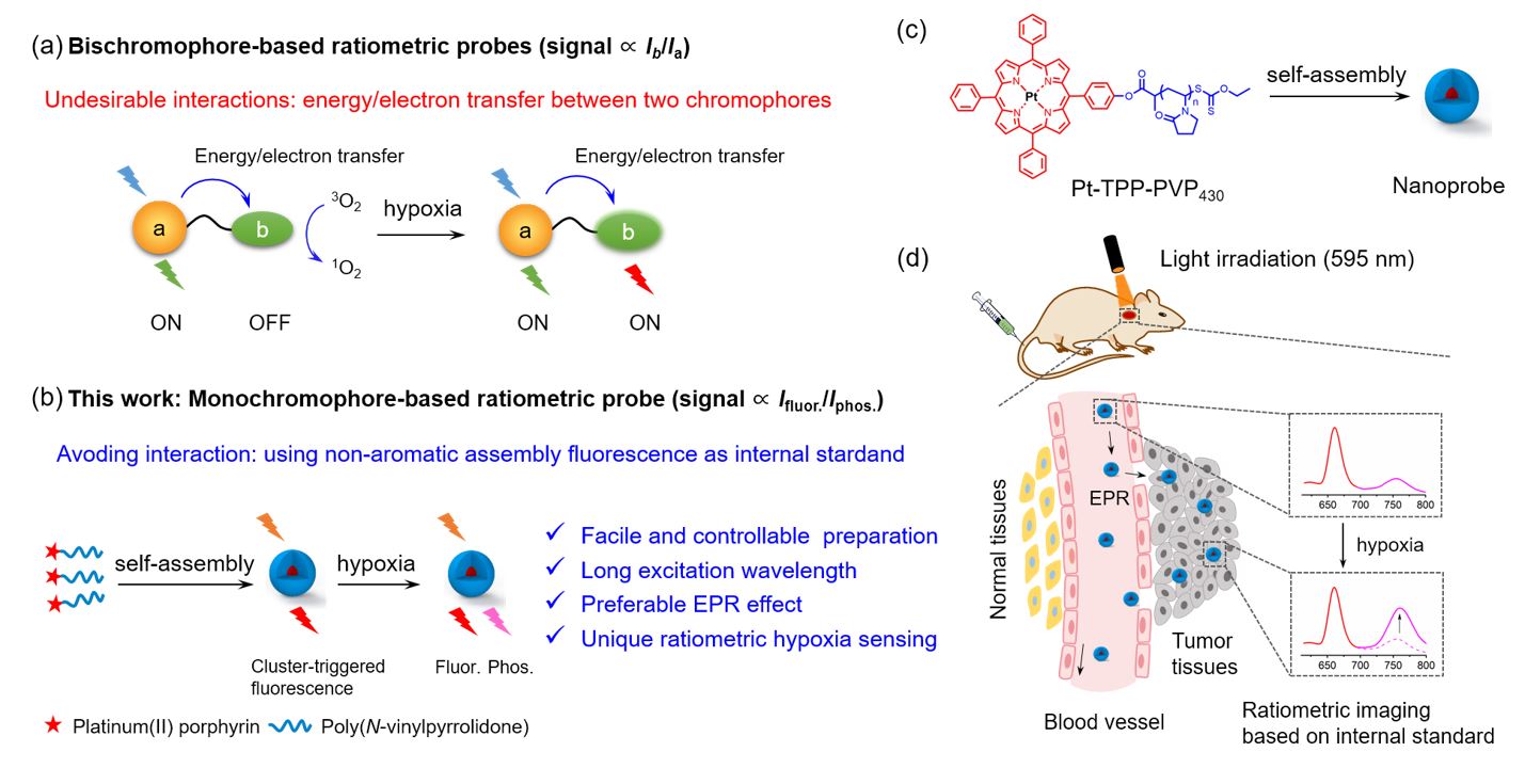 分子荧光探针作为一种能够对疾病早期诊断及检测的重要工具在生物医学领域具有非常广阔的应用前景。最近,365英国上市集团官网朱为宏教授和郭志前教授团队在智能型分子荧光探针精准检测研究领域取得突破性进展,相关研究成果连续发表于国际一流学术期刊《先进材料》(Adv. Mater.,DOI:10.1002/adma.201805735)和《化学科学》(Chem. Sci.,DOI:10.1039/c8sc04266g),其中一篇研究论文被ChemSci Pick of the Week以“Probing for answers on cancer”为题进行亮点报道(http://www.rsc.org/news-events/journals-highlights/2018/oct/probing-for-answers-on-cancer/)。 基于特异性荧光分子探针将肿瘤组织标志物的表达水平转换为光学信号,能直观地实现对肿瘤微环境的定性或定量化研究。然而,由于许多肿瘤标志物的表达水平在肿瘤组织和正常组织中差异并不大,往往难以实现对肿瘤微环境的高特异性和信噪比的检测。研究团队围绕发展高灵敏度、高专一性的分子荧光探针在生物医学应用领域的精准检测开展了多项创新工作。 在实体瘤中有一种常见现象是肿瘤供氧不足,也叫肿瘤乏氧,它与癌症的发生、发展和转移息息相关。癌细胞的异常增殖会产生局部的乏氧微环境,因此发展专一识别、高灵敏的乏氧分子探针对肿瘤诊断具有非常重要的意义。研究人员巧妙地构建了非芳香性团簇发光策略,首次发展了一种单荧光团内标比率型纳米荧光探针,成功地实现了对肿瘤乏氧的定量检测,为解决传统的乏氧荧光探针检测精度问题提供了一种重要研究工具。该分子探针在两个不同的波长同时分别表达对氧气惰性的荧光信号和氧气敏感的磷光信号,能完美地实现单荧光团体系对乏氧进行比率检测,有效地克服传统探针体系中能量/电子转移所引起的干扰,表现出良好的光/pH稳定性和较低的细胞毒性,在细胞和活体层面均能够实现乏氧精准检测与实时成像。研究成果以“Self-Assembly of Monochromophore-Based Polymer Enables Unprecedented RatiometricTracing of Hypoxia”为题在线发表于《Advanced Materials》杂志上(Adv. Mater. 2018, DOI: 10.1002/adma.201805735),原文链接:https://onlinelibrary.wiley.com/doi/10.1002/adma.201805735。