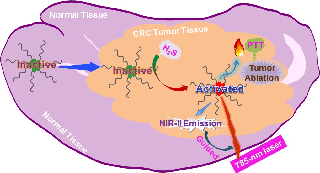 光热治疗(PTT)是一种新型肿瘤治疗方法,利用光热材料可将近红外光转化为热的特点,实现热消融细胞。PTT具有非侵入、过程简单、正常组织损伤小等优点,近年来受到了研究人员的广泛关注。但是,已有的光热材料不具有肿瘤特异性,发展具有可激活性和肿瘤靶向性的光热材料具有非常重要的意义。 基于上述问题,研究人员创新的设计合成了一个硫化氢激活性(activatable)光热材料。硫化氢可特异性激活该纳米材料产生光热特性和近红外二区荧光,从而实现了硫化氢过表达肿瘤的靶向性光热治疗。该研究对开发新型肿瘤精准诊疗试剂具有重要的参考价值。 该论文主要由博士生石奔、硕士生唐洁、博士生闫庆龙等完成,同时得到了药学院杨有军教授课题组的大力支持,并得到了田禾院士的悉心指导。近期,赵春常教授课题组在分子和纳米探针研究领域取得系列进展,获得了具有可见光、近红外一区、近红外二区、光声成像性能的智能型分子及纳米探针(J. Am. Chem. Soc.2015, 137, 8490; ACS Appl. Mater. Interfaces2017, 9, 35588; Chem. Sci.2017, 8, 2150; Biomaterials, 2018, 159, 82; Angew. Chem. Int. Ed.2018, 57, 3626.),实现了以硫化氢为靶点的肿瘤成像研究。 该研究成果得到了国家自然科学基金和国家重点研发项目等资助。 |