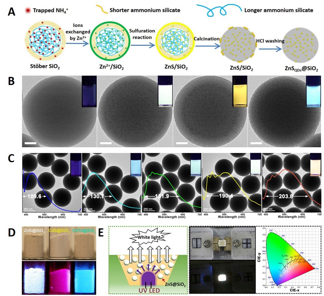 传统的发白光无机量子点(QDs)的制备方法主要依赖于将三原色(红、黄、蓝)发光量子点封装在固体矩阵中,这一方法面临着量子点易团聚发生荧光猝灭、合成控制复杂难以量产等重大挑战。近日,365英国上市集团官网化学与分子工程学院邢明阳教授与美国加州大学河滨分校Yadong Yin教授合作,在纯水相合成白光量子点领域取得重大研究进展,相关成果“Confined Growth of Quantum Dots in Silica Spheres by Ion Exchange of ‘‘Trapped NH4+” for White-Light Emission”在线发表于《Chem》(IF: 18.205)杂志上。 该研究团队开发了一种直接在SiO2小球体相内生长量子点的液相合成新方法——“trapped NH4+”离子交换法(图A)。他们利用“trapped NH4+”易与Zn2+、Cd2+等金属阳离子发生离子交换反应的特性,成功将金属阳离子引入SiO2小球体相(图A,B)。再通过室温硫化直接生成金属硫化合物。最后通过巧妙的酸洗与醇洗过程(酸的浓度需要调控),可选择性地将SiO2小球表面覆盖的“bulk”硫化物洗掉,再通过高温煅烧实现SiO2小球体相量子点的晶化。在煅烧过程中,利用SiO2小球体相孔道的“限域效应”,有效抑制了量子点晶化过程中团聚现象的发生。与此同时,不同尺寸孔道的“限域效应”可以很好地控制量子点的尺寸分布,使制得的量子点在紫外光照射下直接发射白光。传统通过三原色量子点的组合构筑白光LEDs的方法重现性较差,且量子点发射波长的半峰宽难以控制。而“trapped NH4+”离子交换法合成量子点的策略,可通过调节煅烧温度,控制SiO2小球的孔道尺寸分布,从而实现对ZnS@SiO2等量子点荧光发射光谱半峰宽的调控(半峰宽可从109.6调节到203.8 nm,图C)。值得注意地是,整个量子点的合成过程是在纯水体系中完成,不需要任何油相试剂,也不需要加入任何有机“capping-agent”。