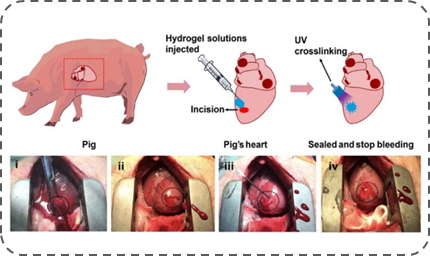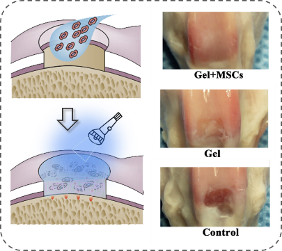 图B:建立具有组织粘附与整合特性的光原位凝胶技术 基于这些技术优势,朱麟勇研究团队于2014年进一步与相关医学单位合作,在动物模型上验证以上光原位凝胶技术的有效性(见图C、D、E)。经过验证证实,该水凝胶材料具有以下几方面作用:一是可作为创面止血封闭材料,其高强度、强组织粘附与快速固化的特征可实现大动物心脏穿透伤导致大流量出血与动脉损伤的瞬时封闭(Nat. Commun., 2019, DOI: 10.1038/s41467-019-10004-7);二是可作为干细胞或其外泌体原位凝胶支架,其组织粘附特性有助于软骨缺损的修复,并促进新生软骨与旧软骨间的整合一体化(Nanoscale, 2017, 9, 4430);三是可作为创面的促修复材料,在无需任何改性条件下,促使自体富含血小板的血浆(PRP)发生“光偶联反应”交联,原位形成高组织粘附力的促创面修复凝胶(Acta Biomaterialia, 2017, 62, 179)。